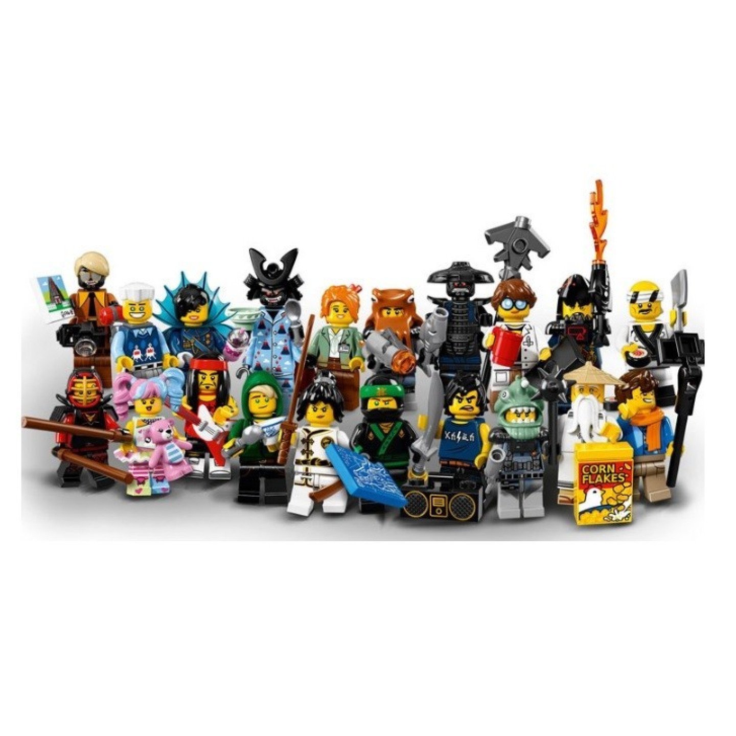 Dodej úžasné nové herní možnosti svým sadám LEGO® NINJAGO® díky LEGO Minifigurkám - sérii, inspirované filmem LEGO NINJAGO FILM, která obsahuje následující minifigurky: Kai Kendo Nya trénující Spinjitzu Lloyd mistr Wu Garmadon Jay Walker Lloyd Garmadon Cole Misako Zane první generál žraločí armády chobotnice ze žraločí armády rybář žraločí armády Velký bílý žralok ze žraločí armády Garmadon ze vzpomínek Sopečný Garmadon Rocker Technik GPL Kuchař sushi N-popová fanynka Každá minifigurka je zabalená v uzavřeném sáčku společně s jedním nebo více doplňky, podstavcem a sběratelskou brožurkou. Každá z minifigurek vychází s jedním nebo více doplňky, navíc s podstavcem a brožurkou pro sběratele. Obsahuje dvě verze Lloyda, tři verze Garmadona a verze Nyi a Kaie, které jsou novinkou pro srpen 2017. Získej tuto sérii LEGO® Minifigurek a vytvářej si své vlastní akcí nabité scény z filmu LEGO NINJAGO® FILM! Mezi doplňky, které jsou novinkou pro srpen 2017, najdeš černý klobouk a zbraň pro Garmadona, šálu pro Jaye, paruky pro Lloyda, Jaye, Nyu, Kaie a Misako, helmu s chobotnicí, rybářskou rybí helmu, misky, lžíce a modrou destičku o rozměrech 2x3 s nákresem pro Lloydova dračího robota. V kombinaci se stavebnicemi LEGO® získáš ještě větší herní možnosti. Bav se při vyměňování minifigurek se svými kamarády.