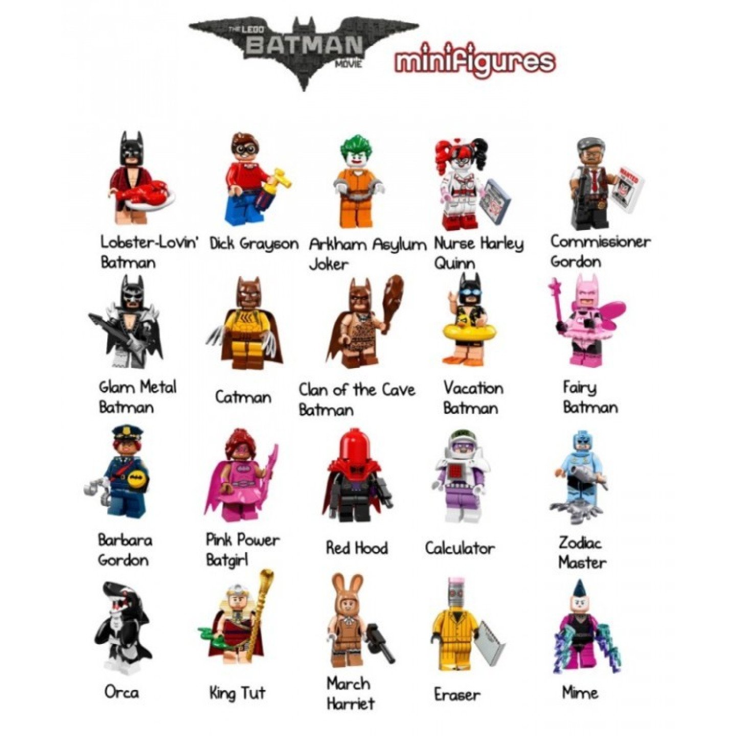 Každá z těchto figurek vychází s cedulkou a s brožurkou pro sběratele. Nasbírej tuto sérii postaviček z „Limitované edice“ LEGO® Minifigures a přehrávej si své vlastní akcí nabité scény z LEGO BATMAN FILM! Každá minifigurka má vlastní speciální příslušenství, stojánek a sběratelský letáček. Figurky prodáváme v originálních NEnastřižených sáčcích s označením konkrétní figurky samolepkou ze zadní strany sáčku. Limit: max. 3ks na zákazníka Batman milující humry Batman metalista Batman víla Batman pračlověk Batman na dovolené Barbara Gordon Komisař Gordon Joker z ústavu Dick Grayson Batmanka Batman Červená karkulka Guma Zdravotní sestra Harley Quinn Orca (kosatka) Mistr Zvěrokruhu Catman March Harriet Kalkulátor Tutanchamon Mim