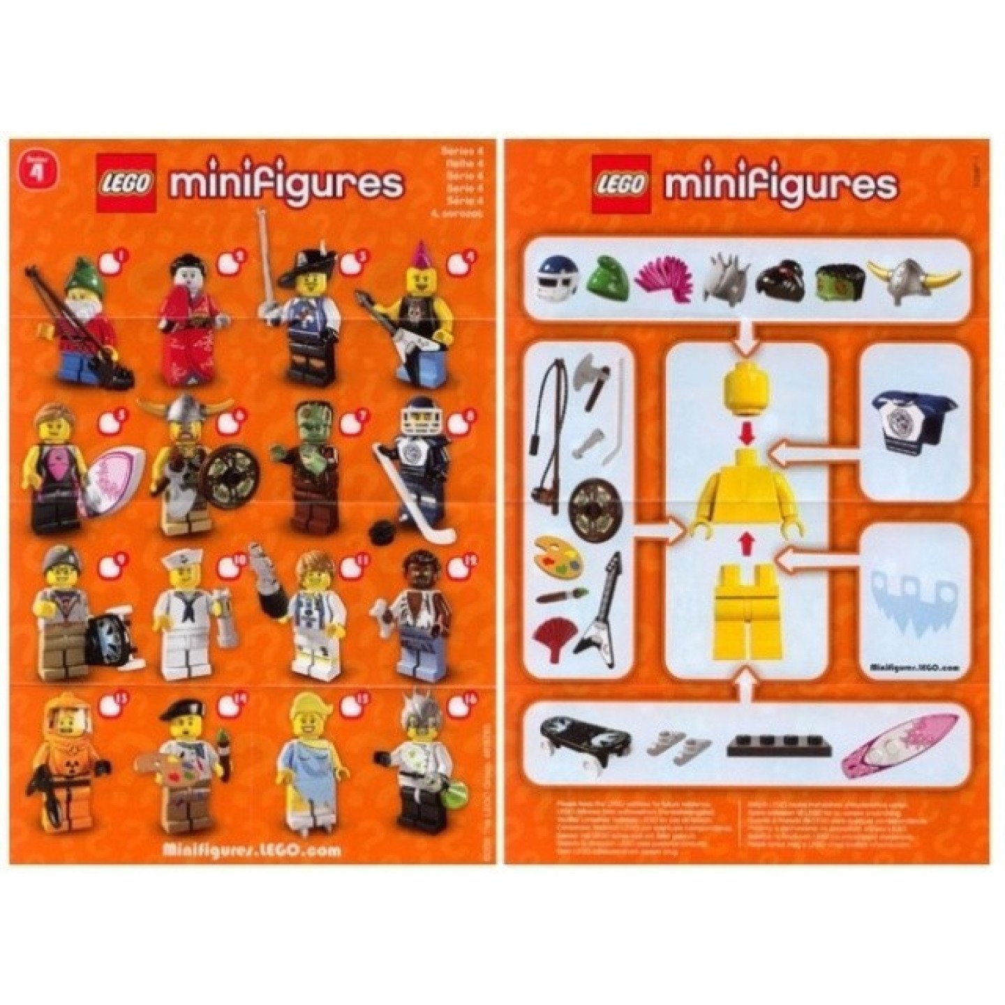 Ucelená kolekce 16 jedinečných Lego minifigurek ze čtvrté série ! Nasbírej všech 16 jedinečných Lego minifigurek ze čtvrté série ! Každá minifigurka má vlastní speciální příslušenství, stojánek a sběratelský letáček. Minifigurky jsou inspirovány filmy, sportem, historií, každodenním životem: Trpaslík, Gejša, Mušketýr, Rocker, Surfařka, Viking, Monstrum, Hokejista, Street skater, Námořník, Fotbalista, Vlkodlak, Radiační kontrola, Malíř, Krasobruslařka, Šílený vědec.