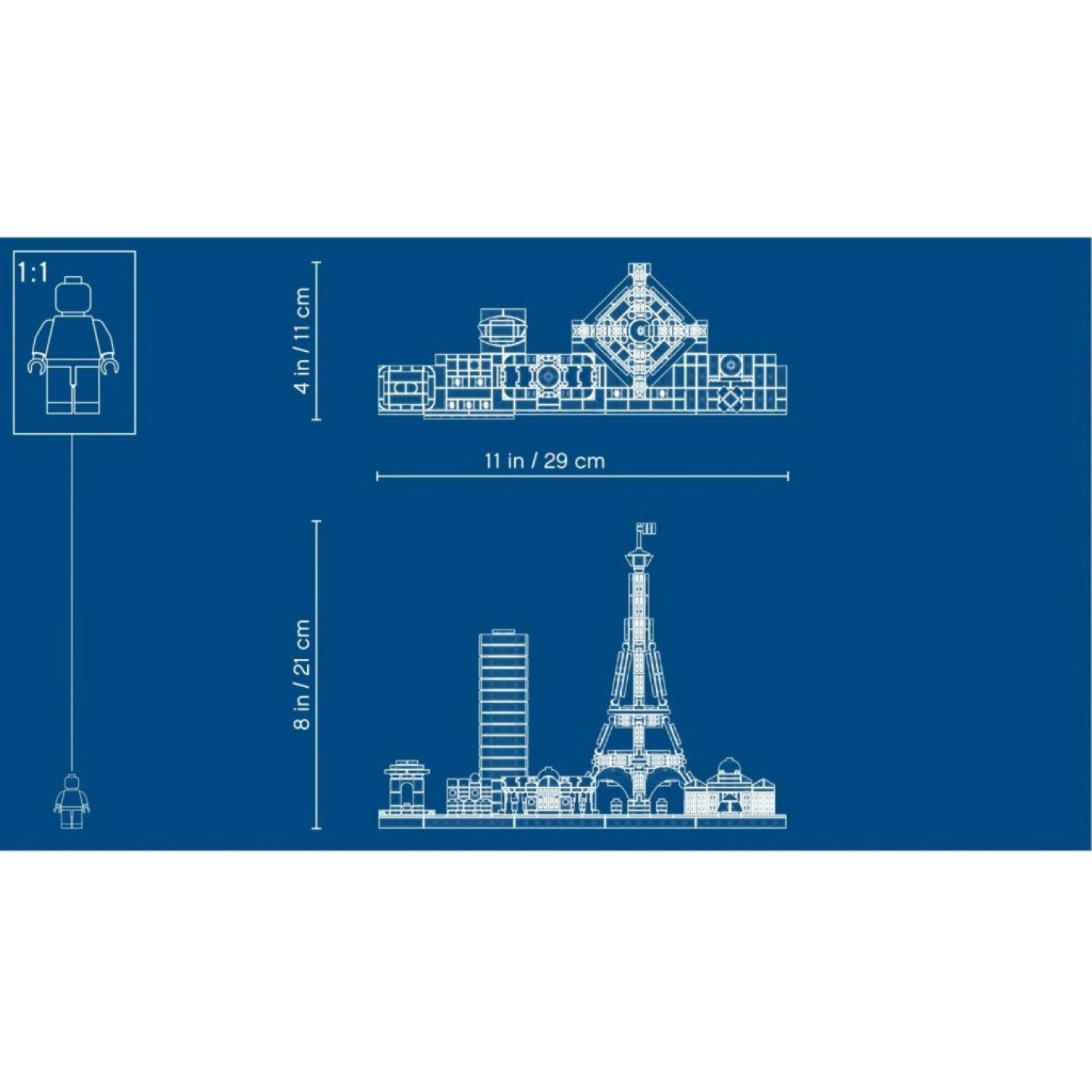 Spoj dohromady nejslavnější pařížská místa díky tomuto nádhernému panoramatickému modelu Paříže. Sada 21044 LEGO® Architecture z kolekce panoramatických stavebnic obsahuje Vítězný oblouk, bulvár Champs-Elysées, výškovou budovu Tour Montparnasse, výstavní pavilon Grand Palais, Eiffelovu věž a slavný Louvre, a navíc ozdobnou cedulku s názvem města. Tato LEGO sada byl navržena tak, aby poskytla příjemný a obohacující zážitek ze stavění všem, kdo se zajímají o architekturu, cestování, historii a design. Tento jedinečný kousek se bude také skvěle vyjímat doma nebo v kanceláři. Každý panoramatický model díky svému měřítku a skutečným barvám představuje věrnou kopii všech budov v menším provedení. LEGO® Architecture interpretace města Paříž. Obsahuje nejslavnější pařížská místa – nechybí Vítězný oblouk, bulvár Champs-Elysées, výškovou budovu Tour Montparnasse, výstavní pavilon Grand Palais, Eiffelovu věž ani slavný Louvre. Součástí modelu jsou i travnaté plochy a stromy. Součástí je brožurka, ve které najdete informace o designérovi, architektuře a historii každé budovy, a také historické informace o Paříži a o jejím architektonickém dědictví. (K dispozici pouze ve francouzštině a angličtině. Překlady do dalších jazyků je možné si stáhnout na LEGO.com/architecture). Obsahuje základní desku o velikosti 4 x 32 s ozdobnou cedulkou s názvem města. Stavěj ta nejdynamičtěji se rozvíjející města na světě se sérií panoramatických stavebnic LEGO® Architecture. Stavebnice LEGO® Architecture oslavují svět architektury a jako prostředek využívají LEGO kostky. Tato kolekce byla vytvořena pro všechny, kteří se zajímají o cestování, design, architekturu a historii. Tato sada obsahuje více než 694 dílků. Měří přes 22 cm na výšku, 28 cm na šířku a 11 cm do hloubky.