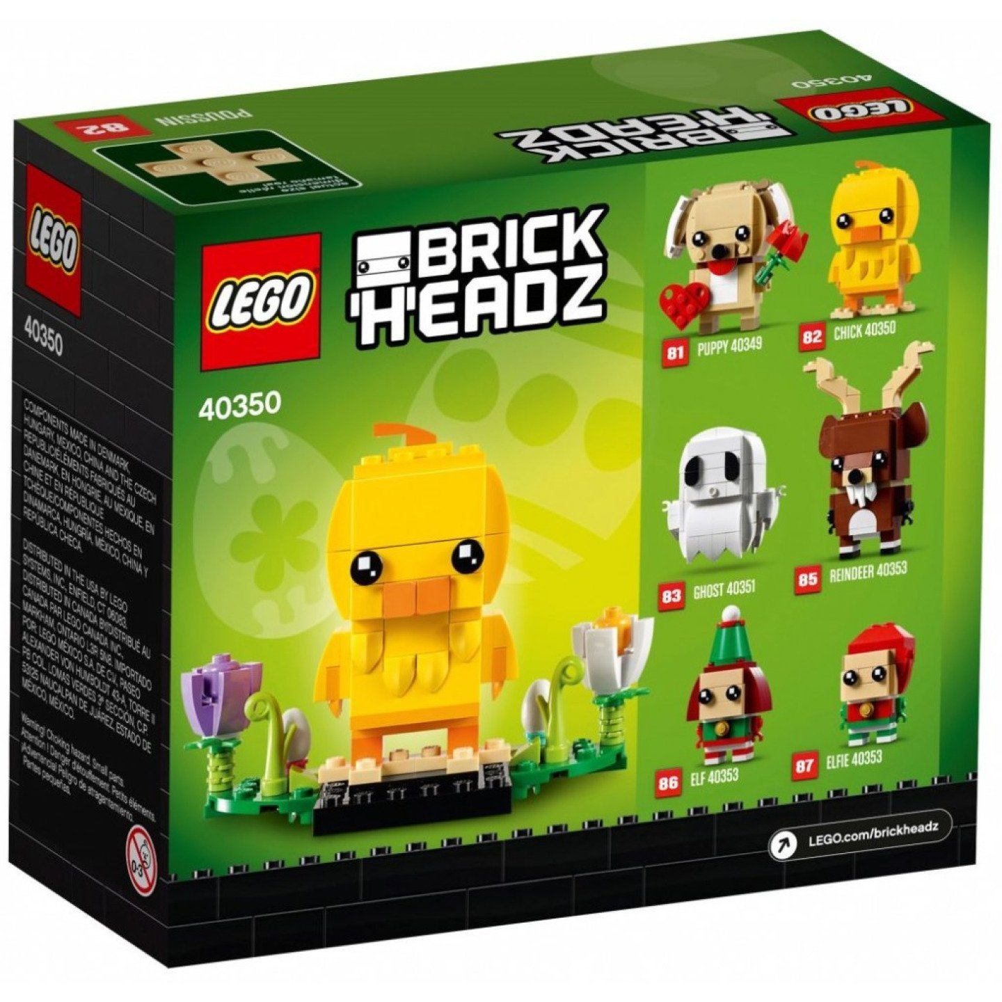 Vykouzli všem úsměv na tváři se sadou LEGO® BrickHeadz™ 40350 Velikonoční kuřátko. Tato rozkošná figurka s kultovníma BrickHeadz očima je v barevném prostředí s velikonočními květinami a listy... a schovanými vajíčky! Sestavitelný model LEGO® BrickHeadz™ velikonočního kuřátka s BrickHeadz očima stojí v barevném prostředí s velikonočními květinami, listy a 2 schovanými vajíčky. Rozšiřuj svou sbírku LEGO® BrickHeadz™ figurek i o další postavy z oblíbených filmů, seriálů, her a komiksů. Spoj jednotlivé LEGO® BrickHeadz figurky dohromady a vytvoř suprového hybrida nebo vlastní úžasnou postavu. Model velikonočního kuřátka měří více než 8 cm na výšku.