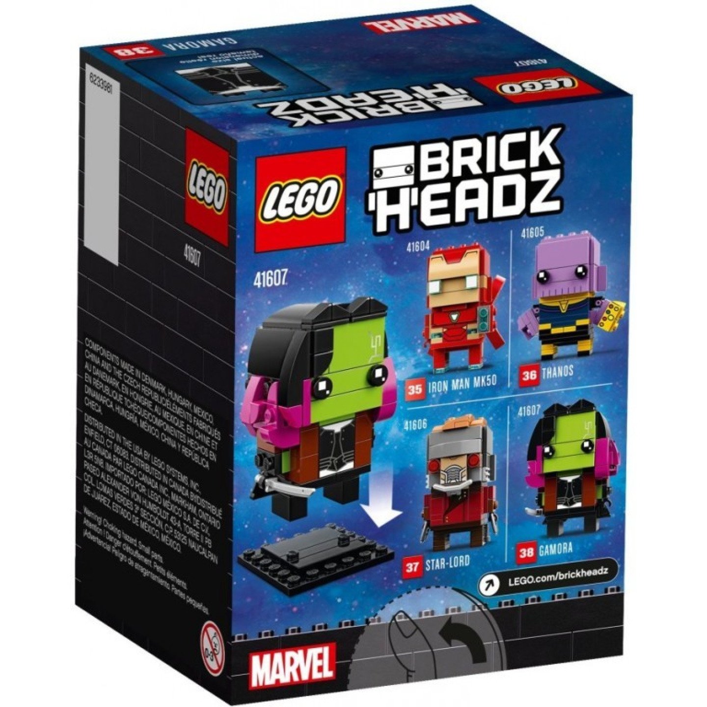 Tato skládací postavička Gamory z řady LEGO® BrickHeadz nabízí spoustu zábavy díky barevným kostkám LEGO a věrnému zpracování detailů ze senzačního filmu Avengers: Infinity War, včetně Gamořiny zelené kůže, vlasů s tmavě růžovým melírem a černého obleku. Figurka má také odnímatelnou hůl a stojí na skládacím sběratelském podstavci, díky kterému se bude skvěle vyjímat doma, v kanceláři nebo kdekoliv jinde. Skládací postavička Gamory z řady LEGO® BrickHeadz ti přináší oči BrickHeadz a autentické detaily z filmu Avengers: Infinity War, včetně Gamořiny jasně zelené kůže, tmavě růžových vlasů a stylového černého obleku, a k tomu navíc odnímatelný meč. Každá figurka LEGO® BrickHeadz obsahuje vlastní skládací sběratelský podstavec. Bav se a rozšiř svou kolekci postaviček LEGO® BrickHeadz o další super hrdiny z filmového hitu Avengers: Infinity War a z mnoha tvých dalších oblíbených filmů, seriálů, her a komiksů. Spoj jednotlivé LEGO® BrickHeadz figurky dohromady a vytvoř super cool hybrida nebo vlastní úžasnou postavu. Tato skládací postavička je vhodná pro děti od 10 let. Bez podstavce měří přes 7 cm na výšku. Podstavec měří přes 4 cm čtvereční.