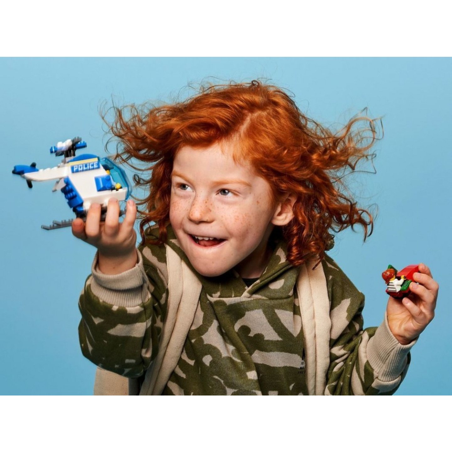 Nekončící policejní dobrodružství vyžadují pouze minifigurky policisty a zlodějky, pouta, bankovky a špetku fantazie. Tato odolná stavebnice pro děti od 4 let obsahuje jednoduchý návod v tištěné podobě a speciální kostku pro snadný začátek stavění, která pomůže pocítit hrdost při sestavování vlastních LEGO modelů i naprostým nováčkům. A díky bezplatné aplikaci s LEGO návody na stavění pro chytré telefony a tablety získají děti přístup i k nástroji Instructions PLUS. Jedná se o interaktivní návod s úžasnými možnosti přibližování a otáčení, se kterým si děti užijí při stavění LEGO sad ještě více zábavy. Policejní sady od LEGO City přinášejí vzrušující stavitelský a herní zážitek díky realistickým modelům a zábavným postavám, které zobrazují skutečný život zábavným a kreativním způsobem. Snadno sestavitelná sada Policejní vrtulník (60275) představuje parádní úvod do světa LEGO® City, kde se kluci a holky od 4 let mohou ponořit do neomezeného kreativního hraní. Co se ukrývá uvnitř krabice? Robustní model policejního vrtulníku, vodní skútr zlodějky a 2 dílky v podobě bankovek, a k tomu navíc minifigurky policisty a zlodějky. Stačí přidat špetku fantazie a zábava nikdy neskončí! Policejní vrtulník nabízí kokpit pro minifigurku, funkční vrtule a otevírací trup pro dopadenouzlodějku. Děti mohou připojit zlodějku a ukradené bankovky k vodnímu skútru. Báječný dárek k Vánocům, narozeninám nebo jakékoli jiné příležitosti pro fanoušky řady LEGO® City a skvělý úvod do světa LEGO City pro kluky a holky od 4 let. Helikoptéra měří přes 8 cm na výšku, 12 cm na délku a 5 cm na šířku, takže nabízí dostatek místa pro policejního pilota z LEGO® City. Vrtulník má dekorativní policejní kostku a světlomet. Tato stavebnice pro děti od 4 let obsahuje jednoduchý tištěný adigitální návod na stavění, ale také speciální začátečnickou kostku, s jejíž pomocí se do sestavování LEGO® modelů mohou směle pustit i začátečníci. Policejní stavebnice řady LEGO® City obsahují barevné budovy, úžasné modely vozidel a zábavné postavy. Děti se tak mohou těšit na nekonečné hodiny kreativního hraní. Všechny LEGO® kostky a dílky jsou vyráběny v souladu s přísnými standardy kvality tak, aby byly konzistentní, kompatibilní a aby se s nimi dobře hrálo – a to již od roku 1958. Sady od LEGO® City procházejí důkladnými testy, abyste měli jistotu, že každý výrobek splňuje přísné bezpečnostní standardy.