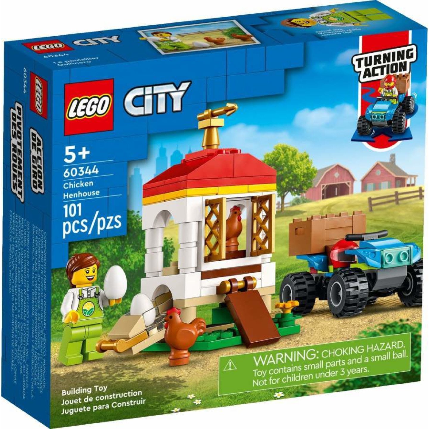 Dopřejte dětem možnost prožívat dobrodružství na farmě se stavebnicí LEGO® City Kurník (60344), která obsahuje model kurníku s otevíracími dvířky a přihrádkou na vejce, parádní terénní čtyřkolku s funkčním řízením, a navíc zábavné doplňky, mezi kterými najdete 2 vajíčka a bedýnku, kterou lze připevnit na zadní část vozidla. Zapojte do akce minifigurku farmářky a 2 figurky slepic a hraní může začít! Zábavné stavebnice pro kluky a holky od 5 let Stavebnice na motivy farmaření obsahuje jednoduchý tištěný návod na sestavení, díky kterému si děti zvládnou s hrdostí postavit vlastní hračky LEGO nebo se mohou pustit do společného stavění s kamarády nebo členy rodiny. Vítejte ve světě LEGO City Stavebnice LEGO City z prostředí farmy nabízí dětem nespočet herních možností díky propracovaným a realistickým modelům budov, vozidel a inspirativním postavám, se kterými se každodenní aktivity promění v zábavu. Stavebnice z prostředí farmy – dopřejte dětem starším 5 let možnost prožívat dobrodružství na farmě se stavebnicí Kurník (60344) od LEGO® City Co se ukrývá v krabici? – Vše, co budou děti potřebovat k sestavení kurníku a čtyřkolky s funkčním řízením, minifigurka farmářky, 2 figurky slepic a další doplňky včetně 2 vajíček Zábavné prvky – děti mohou sbírat vejce z výsuvné přihrádky kurníku a řídit čtyřkolku nakláněním řídítek do stran Vhodný dárek pro děti od 5 let – stavebnice LEGO® City Kurník skvěle poslouží jako narozeninový nebo vánoční dárek či spontánní překvapení k jakékoliv příležitosti Hraní na cestách – po sestavení kurník měří 9 cm na výšku, 6 cm na šířku a 5 cm do hloubky – ideální velikost na hraní doma i na cestách Zábavné doplňky pro minifigurku – součástí stavebnice jsou dílky helmy pro řidičku čtyřkolky, bedýnka, 2 vejce a květina Návod pro malé stavitele – obsahuje srozumitelné obrázkové pokyny k sestavení Učení hravou formou – stavebnice LEGO® City z prostředí farmy obsahují budovy, vozidla a postavy, které podněcují děti k nápaditému hraní a pomáhají jim s rozvojem kreativních dovedností a sebevědomí Záruka kvality – už od roku 1958 splňují všechny kostky LEGO® nekompromisní oborové standardy, díky čemuž jsou konzistentní, kompatibilní a zaručují zábavné hraní Bezpečnost na prvním místě – dílky LEGO® pouštíme na zem, zahříváme, drtíme, kroutíme a analyzujeme, abychom zajistili, že splňují přísné globální bezpečnostní normy