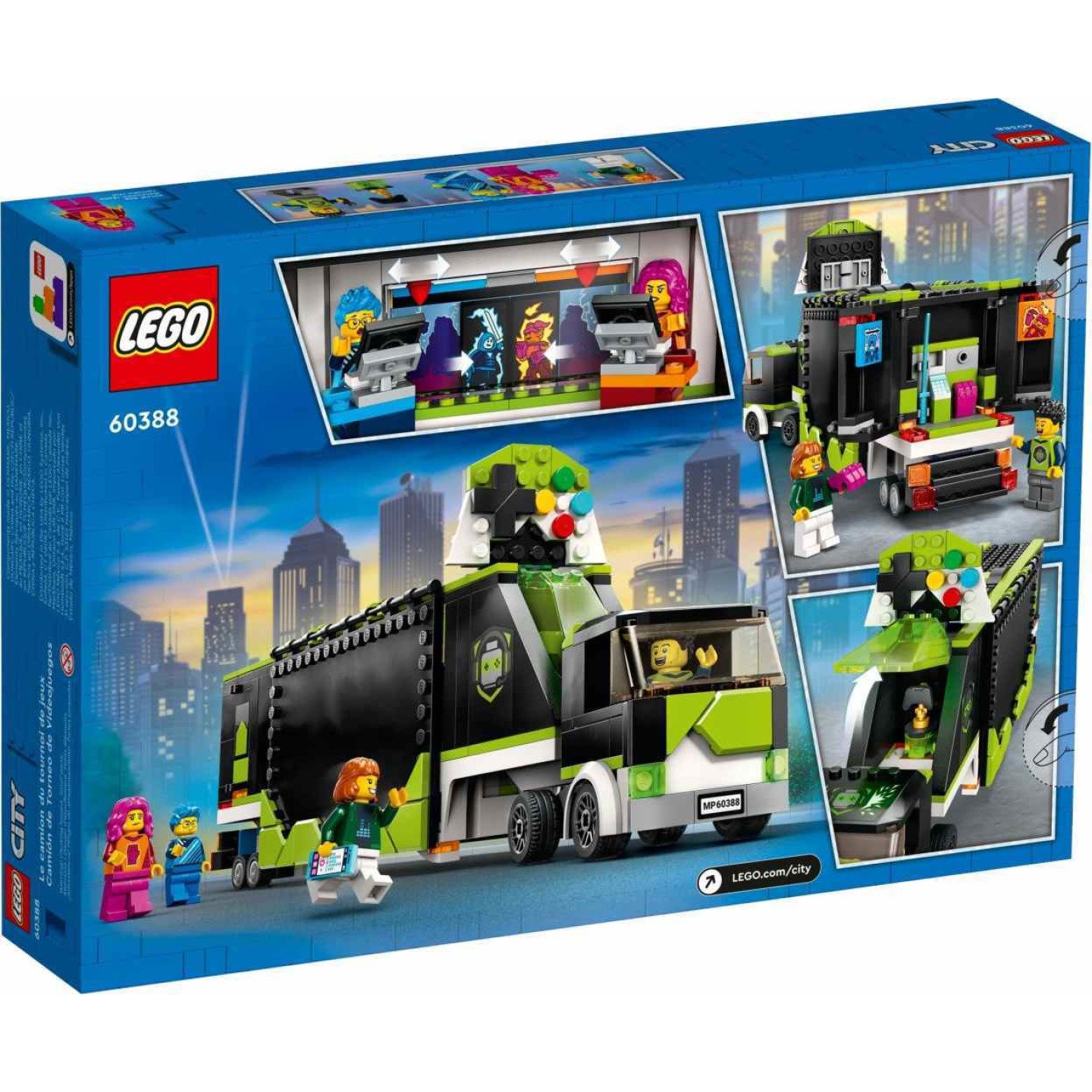 Stavebnice Herní turnaj v kamionu (60388) od LEGO® City je doslova nabitá prvky podporujícími kreativní hraní. Otevřete přívěs a odkryjte pódium se 2 herními stanicemi a velkoplošnou obrazovkou se zábavnou funkcí „animace“. Dále nesmí chybět trofej pro vítěze a super zboží pro fanoušky eSportu v LEGO City. Pak už zbývá jen přidat minifigurky moderátora a hráčů a turnaj může začít! Obsahuje interaktivní digitální návod na stavění Tato stavebnice pro děti od 7 let je doplněna obrázkovými pokyny a aplikací LEGO Builder, která nabízí úžasný digitální návod na stavění s nástroji přibližování a otáčení, aby si děti mohly během stavění vizualizovat hotový model ze všech úhlů. Super dárky pro děti Vyrůstáme obklopení úžasnými vozidly a stroji. Stavebnice ze série Skvělá vozidla LEGO City dětem umožní prozkoumat je pěkně zblízka díky realistickým modelům a inspirativním postavám pro kreativní hraní. Model z prostředí herního turnaje – Stavebnice Herní turnaj v kamionu (60388) od LEGO® City doslova překypuje vybavením pro imaginární herní klání Co se ukrývá v krabici? – Vše, co děti potřebují k sestavení kamionu a herního turnaje, včetně pódia, 2 herních stanic a velkoplošné obrazovky. Chybět nesmí ani trofej pro vítěze, zboží pro fanoušky a 3 minifigurky Zábavné funkce rozšiřují herní možnosti – Děti mohou animovat záběry z her na velkoplošné obrazovce a upravovat lištu zobrazující postup ve hře, aby byly soupeřící minifigurky pořádně motivované Dárek pro každou příležitost – Zábavný dárek k narozeninám, Vánocům nebo jakékoli jiné příležitosti pro děti od 7 let Rozměry – Model Herní turnaj v kamionu od LEGO® City měří přes 13 cm na výšku, 33 cm na délku a 6 cm na šířku Doplňky pro minifigurky – Mezi doplňky LEGO® v této stavebnici patří trofej pro vítěze, mikrofon, mobilní telefon a herní předměty, včetně velkých pěstí a meče Ještě více zábavy s digitálním návodem na stavění – Díky aplikaci LEGO® Builder s návody pro chytré telefony a tablety si děti mohou model přibližovat, otáčet a prohlížet ze všech úhlů Učení hrou – Stavebnice LEGO® City pomáhají dětem rozvíjet sebevědomí a klíčové dovednosti pro život otevřeným, nápaditým hraním Jistota kvality – Všechny kostky LEGO® splňují nekompromisní oborové standardy, díky čemuž jsou dílky konzistentní, kompatibilní a zaručují zábavné hraní Bezpečnost na prvním místě – Kostky a dílky LEGO® pouštíme na zem, zahříváme, drtíme, kroutíme a analyzujeme, abychom zajistili, že splňují striktní globální bezpečnostní standardy