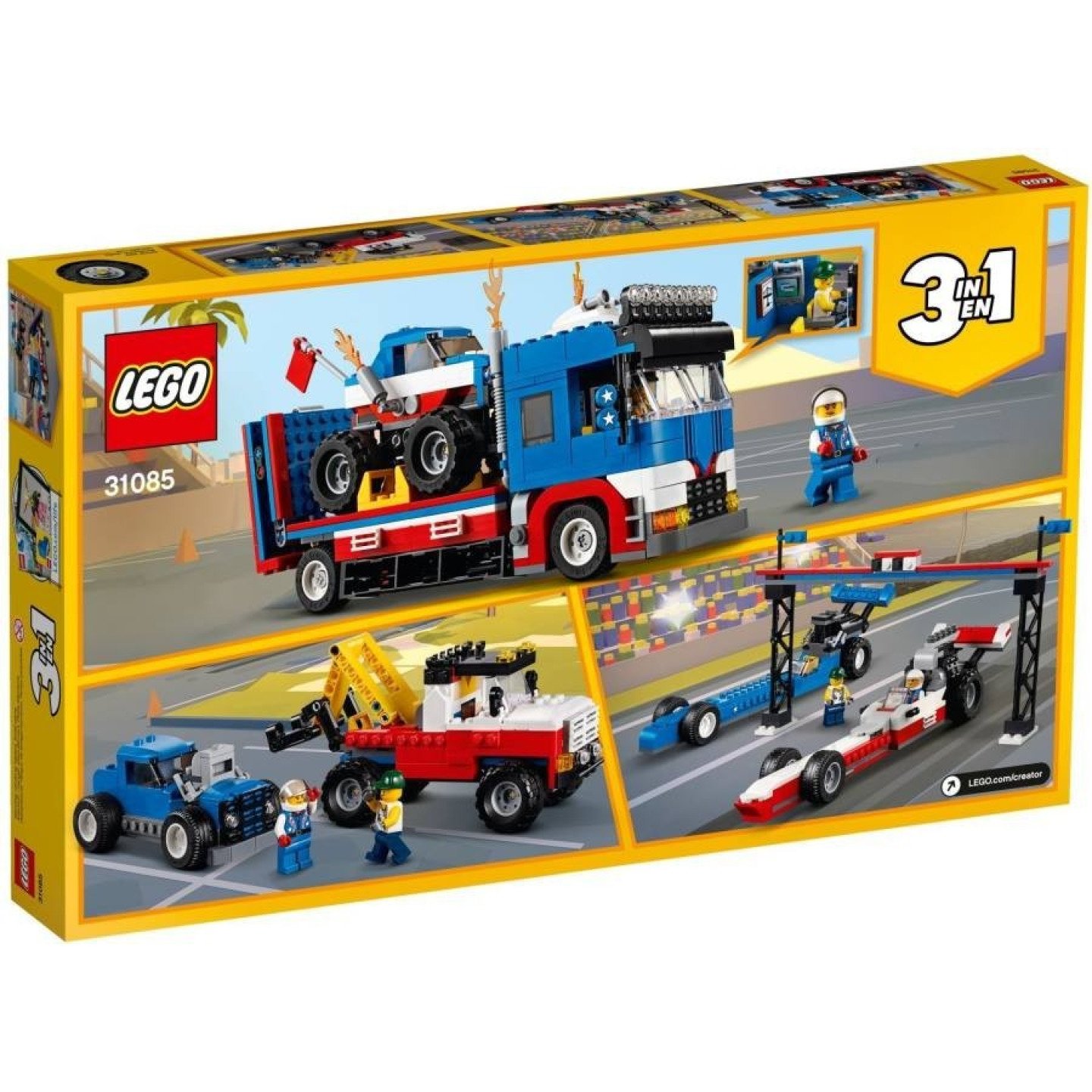 Předveď velkolepé vystoupení se sadou 3v1 31085 Mobilní kaskadérské představení od LEGO® Creator. Vylož monster truck a věž se světlomety z transportéru, rozlož skokánky a rampy a show může začít! Plochý transportér obsahuje 2 ohnivé výfuky a propracovanou kabinu řidiče s postelí a televizí. Tento model 3v1 lze pro ještě více kaskadérských kousků přestavět na Stylový pickup nebo 2 závodní dragstery. Obsahuje 2 minifigurky: kaskadérku a jejího spolehlivého mechanika. Obsahuje 2 minifigurky: kaskadérku a jejího spolehlivého mechanika. Obsahuje plochý transportér se skládacím skokánkem a rampou, a navíc monster truck a věž s reflektory. Nastav reflektory, zaklínuj kola transportéru a spusť rozkládací rampy. Potom nakopni monster truck, naber maximální rychlost a předveď perfektní dopad! Nalož monster truck na transportér a vyraz na další vzrušující kaskadérskou show! Omrkni suprovou kabinu řidiče s postelí a televizí. Kombinace červené, bílé a modré barvy s hvězdičkami. Přestav tento model 3v1 na Stylový pickup nebo 2 závodí dragstery a show může pokračovat. Transportér měří přes 12 cm na výšku, 23 cm na délku a 9 cm na šířku. Monster truck měří přes 9 cm na výšku, 14 cm na délku a 7 cm na šířku. Každý závodní dragster měří přes 7 cm na výšku, 27 cm na délku a 6 cm na šířku. Stylový pickup měří přes 5 cm na výšku, 12 cm na délku a 6 cm na šířku. Pickup měří přes 9 cm na výšku, 20 cm na délku a 7 cm na šířku.
