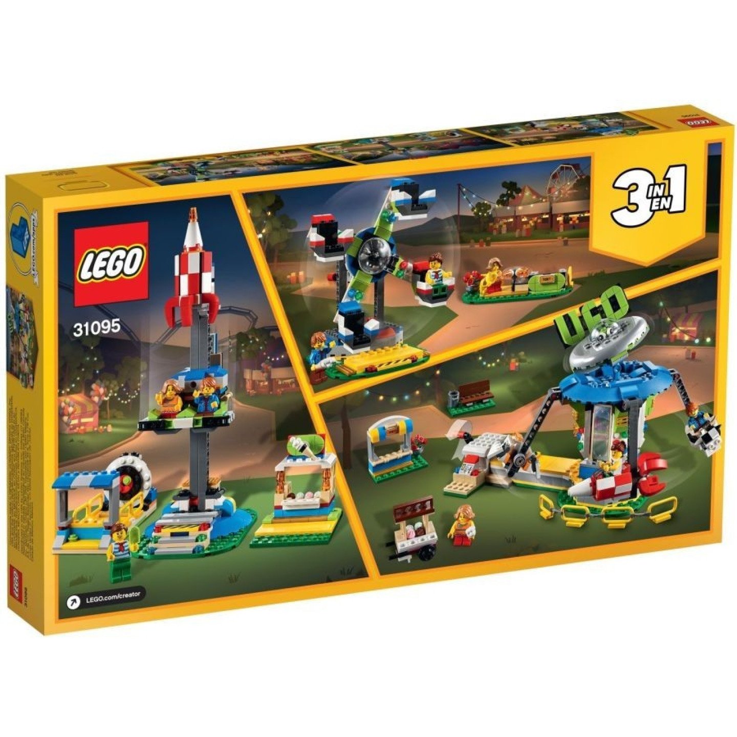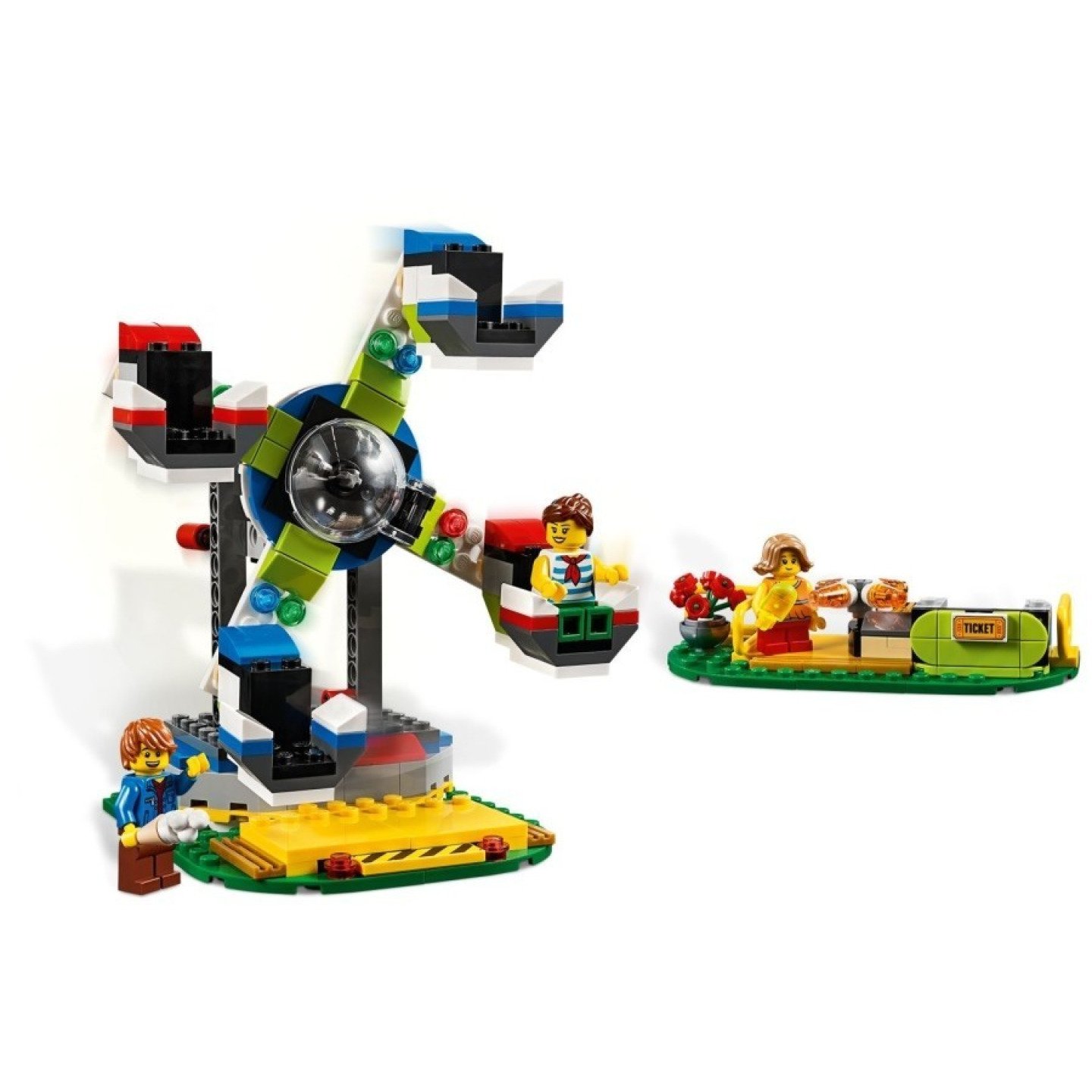 Kupte si lístek, projděte turniketem a užijte si adrenalinovou jízdu na jednom ze tří fantastických kolotočů. Pořád ještě nemáte dost? Udělejte dojem na kamarády a pokuste se trefit míčkem do terče. Až se nabažíte všech atrakcí, posaďte se na lavičku a užívejte si tu pravou pouťovou atmosféru s kopečkovou zmrzlinou v ruce. Tak pospěšte, zábava s LEGO Creator čeká! Nákup na legenio.cz, to je rychlé odeslání za skvělé ceny! Obsah balení: 3 minifigurky: chlapec a dvě dívky 3 modely v 1: UFO kolotoč, ruské kolo a volný pád lavička v parku vozík se zmrzlinou stánek se vstupenkami