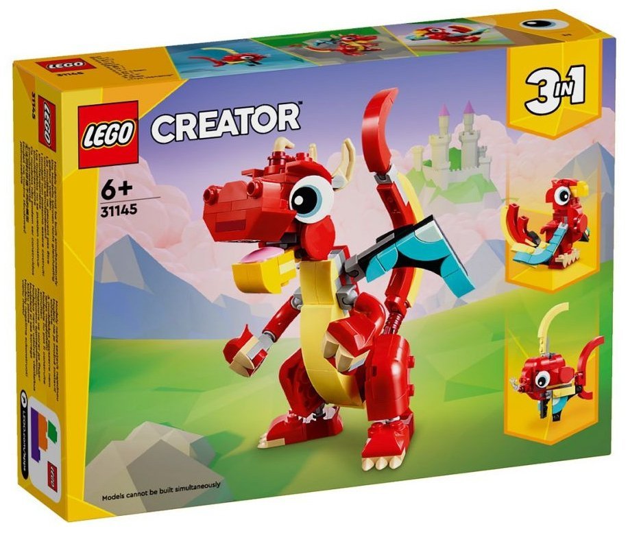 Kreativní děti od 6 let se se stavebnicí LEGO® Creator 3 v 1 (31145) Červený drak vydají do kouzelné země plné příběhů. Postaví si přátelského draka s velkýma očima a pohyblivými pažemi, tlapami, křídly, nohama, chodidly, hlavou a tlamou. Až velkolepá dobrodružství skončí, model si vystaví v pokojíčku. Stavebnice LEGO® Creator 3 v 1 dětem přináší svět nekonečných herních možností. Ze stejné sady kostek si postaví hned 3 různá zvířata: Poskládají si pohyblivého draka, přestaví jej na fénixe s pestrobarevnými křídly a toho poté přetvoří na hračku rybky nebo si vytvoří vlastní zvířátko z kostek LEGO. Stavebnice LEGO Creator 3 v 1 představují skvělé dárky pro děti. Malí stavitelé v každé krabici najdou dílky k sestavení a přestavování 3 různých modelů. Se stavebnicemi 3 v 1 je čekají hodiny zábavy a postaví si s nimi modely inspirované jejich zájmy, včetně superrychlých vozidel, úžasných zvířat a propracovaných městských scén. 3 kouzelná zvířata v jedné stavebnici – Děti od 6 let se se stavebnicí LEGO® Creator 3 v 1 Červený drak ponoří do stavění a přestavování 3 pestrobarevných modelů z jedné sady kostek Nekonečné herní možnosti – Malí stavitelé si vychutnají zábavné příběhy se 3 různými modely zvířat: Proletí se s drakem, vydají se na dobrodružství ve vzduchu s fénixem a zaplavou si s rybkou Pohyblivé figurky zvířat – Každý model má pohyblivé části těla: Drak dokáže hýbat pažemi, tlapkami, křídly, nohama, chodidly a tlamou, fénix hýbá křídly a rybka může pohybovat ploutvemi Výstavní modely – Každý ze 3 modelů zvířat LEGO® si děti po hraní mohou vystavit v pokojíčku Nápad na dárek pro děti – Tato hračka 3 v 1 přináší skvělý stavitelský a herní zážitek pro malé stavitele a představuje skvělý dárek k příležitosti čínského nového roku 3 porce zábavy v 1 – Užijte si ještě více zábavy s dalšími stavebnicemi z řady LEGO® Creator 3 v 1 (prodávají se samostatně) s úžasnými zvířaty, skvělými vozidly a propracovanými městskými scénami Hračky LEGO® Creator 3 v 1 – S každou ze stavebnic 3 v 1 si děti postaví 3 různé modely inspirované jejich zájmy, včetně zvířat, vozidel a propracovaných městských scén Stavějte a hrajte si – Tato stavebnice LEGO® se skládá ze 149 dílků a součástí je model draka, který měří přes 12 cm na výšku