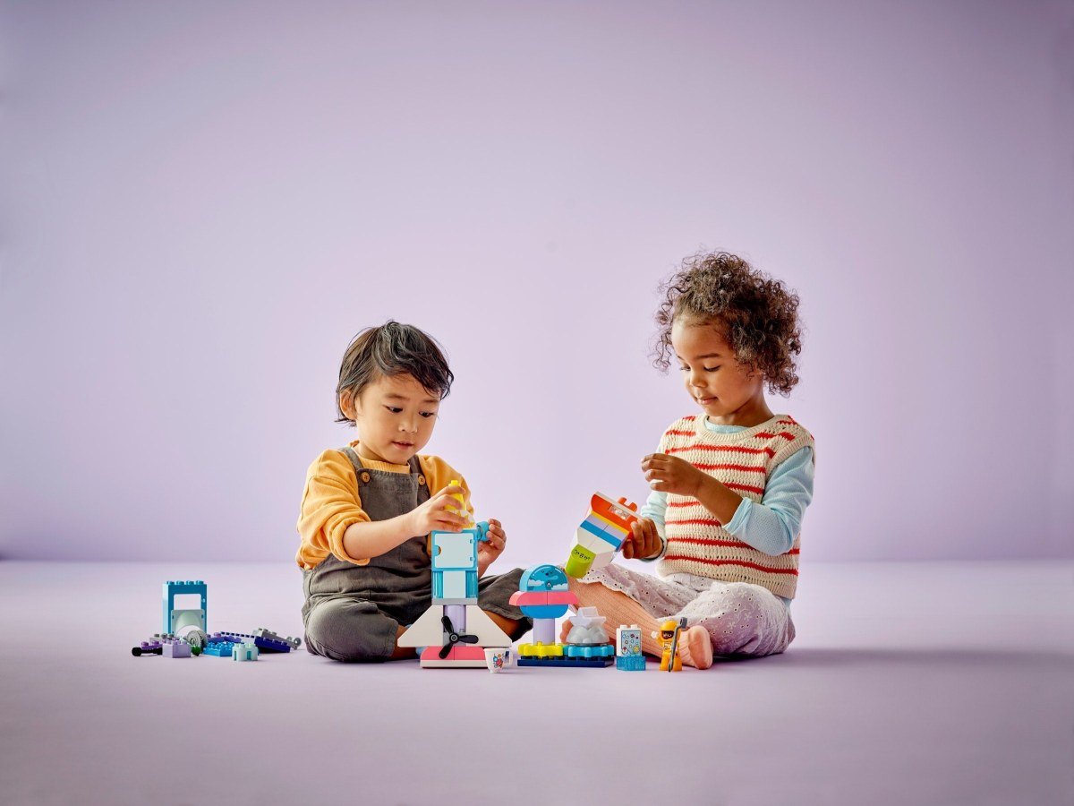 3… 2… 1… start! Vydejte se na akční výpravu se stavebnicí Vesmírné dobrodružství s raketoplánem 3 v 1 (10422). Sada inspiruje malé stavitele od 3 let ke hře na astronauty, kteří prozkoumávají galaxii v modelu raketoplánu, setkávají se s mimozemšťany a poznávají sluneční soustavu. Tato vesmírná hračka je plná zábavných doplňků, které podněcují kreativní hraní. Děti prozkoumají nové obzory a prožijí galaktická dobrodružství se 2 figurkami LEGO® DUPLO® astronautů – spřátelí se s mimozemšťanem nebo se třeba vydají opravit raketoplán pomocí hasáku. Součástí této stavebnice 3 v 1 je spousta zajímavých kostek a dílků, které lze přeskládat na 2 další vesmírná vozidla, vesmírnou základnu a jakékoli další modely, jaké si děti dokážou představit. Hraní je tak nekonečná zábava! Tato vzdělávací sada navíc pomáhá prohlubovat jemné motorické schopnosti – děti si vyzkouší hraní s ozubenými koly, otočnou vrtulí, navijákem, dveřmi s panty a světelnou kostkou. Přestavitelný model raketoplánu – Potěšte malé astronauty od 3 let stavebnicí LEGO® DUPLO® Vesmírné dobrodružství s raketoplánem 3 v 1 Krabice plná zábavy – Součástí stavebnice je řada barevných kostek a doplňků ke hraní a figurka LEGO® DUPLO® mimozemšťana a 2 astronautů a děti se s ní vydají na nekonečná vesmírná dobrodružství Hračka pro rozvoj dovedností – Děti při otáčení navijáku, roztáčení vrtule a otevírání dveří zdokonalí své jemné motorické schopnosti a při stavění vesmírných vozidel prohloubí kreativní myšlení Součástí je světelná kostka – Zábavná světelná kostka (baterie jsou součástí balení) pozvedne vesmírnou stavebnici na zcela novou úroveň Vesmírný dárek pro malé děti – Udělejte radost malým astronautům od 3 let a darujte jim vzdělávací hračku, která rozvíjí kreativní hraní příběhů Kvalitní výrobek pro malé stavitele – Kostky a dílky z této stavebnice LEGO® DUPLO® raketoplánu pouštíme na zem, drtíme, kroutíme, zahříváme a analyzujeme, abychom zajistili, že splňujípřísné normy týkající se bezpečnosti dětí Podpořte dětskou zvídavost – Stavebnice LEGO® DUPLO® rozvíjejí klíčové dovednosti malých stavitelů a prohlubují jejich zájem o Zemi i o vesmír Spousta kostek pro úžasné herní zážitky – Stavebnice se skládá z 58 dílků a součástí je model raketoplánu, který měří přes 35 cm na výšku, 18 cm na délku a 19 cm na šířku