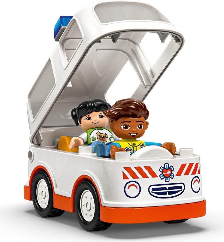 Starostlivé děti si užijí hraní napínavých záchranářských scén se stavebnicí Sanitka a řidič (10447). Součástí je pojízdná sanitka a 2 figurky LEGO® DUPLO®, záchranář a dívka, se kterými si děti užijí kreativní hru na postavy. Tato kreativní hračka LEGO DUPLO představuje skvělý dárek pro malé děti, které mají rády hry na rozvoj sociálních a emočních dovedností, a pomůže jim prohlubovat empatii. Součástí návodu na stavění je tištěné herní kolečko, se kterým rodiče a děti prozkoumají různé emoce postavičky holčičky. Děti s jeho pomocí vyjádří své pocity při tom, když se někdo necítí dobře, nebo jak se cítily, když poprvé viděly sanitku. Stavebnice také pomáhá rozvíjet logické myšlení při sestavování sledu událostí a jemné motorické dovednosti při otevírání střechy sanitky, přes kterou umístí figurku na sklápěcí lůžko. Tato vzdělávací hračka také pomáhá malým dětem rozvíjet sociální dovednosti při rozhodování, jak bude řidič sanitky zacházet s pacientkou. Hračka se sanitkou – Malí stavitelé zinscenují napínavé záchranářské scénáře inspirované skutečným životem se stavebnicí Sanitka a řidič, ve které najdete sanitku a malý domek Hračka inspiruje děti ke hře na záchranáře – Malé děti si procvičí hraní na postavy a logické myšlení při hraní na ošetřování dívky v sanitce a poté ji odvezou do nemocnice Sociálně-emocionální vzdělávací aktivity – Součástí je figurka řidiče sanitky a dívky, vozidlo, taška a lékárnička, aby si děti mohly procvičovat sociální dovednosti a naučit se, jak se zdravotníci starají o pacienty Kreativní hračka pro děti – Malí stavitelé si procvičí empatii při hře s figurkou pacientky s digitálním herním kolečkem, které je součástí návodu na stavění v aplikaci LEGO® Builder Tip na narozeninový dárek pro malé děti – Tato hračka představuje skvělý dárek k výjimečné příležitosti nebo Vánocům pro děti od 2 let a kluky a holky, kteří milují tvořivé hraní se sanitkou Sociálně-emocionální vzdělávací hračky – Na další nové zážitky a hraní na postavy se můžete těšit se stavebnicí LEGO® DUPLO® Město První návštěva u lékaře (prodává se samostatně) Pečlivě navržené vzdělávací hračky pro zvídavé děti – Nápadité hračky LEGO® DUPLO® jsou speciálně navrženy tak, aby malým dětem pomohly porozumět světu, který vidí kolem sebe Rozměry – Tato vzdělávací stavebnice pro malé děti se skládá z 19 dílků a součástí je sanitka, která měří přes 10 cm na výšku, 14 cm na délku a 7 cm na šířku