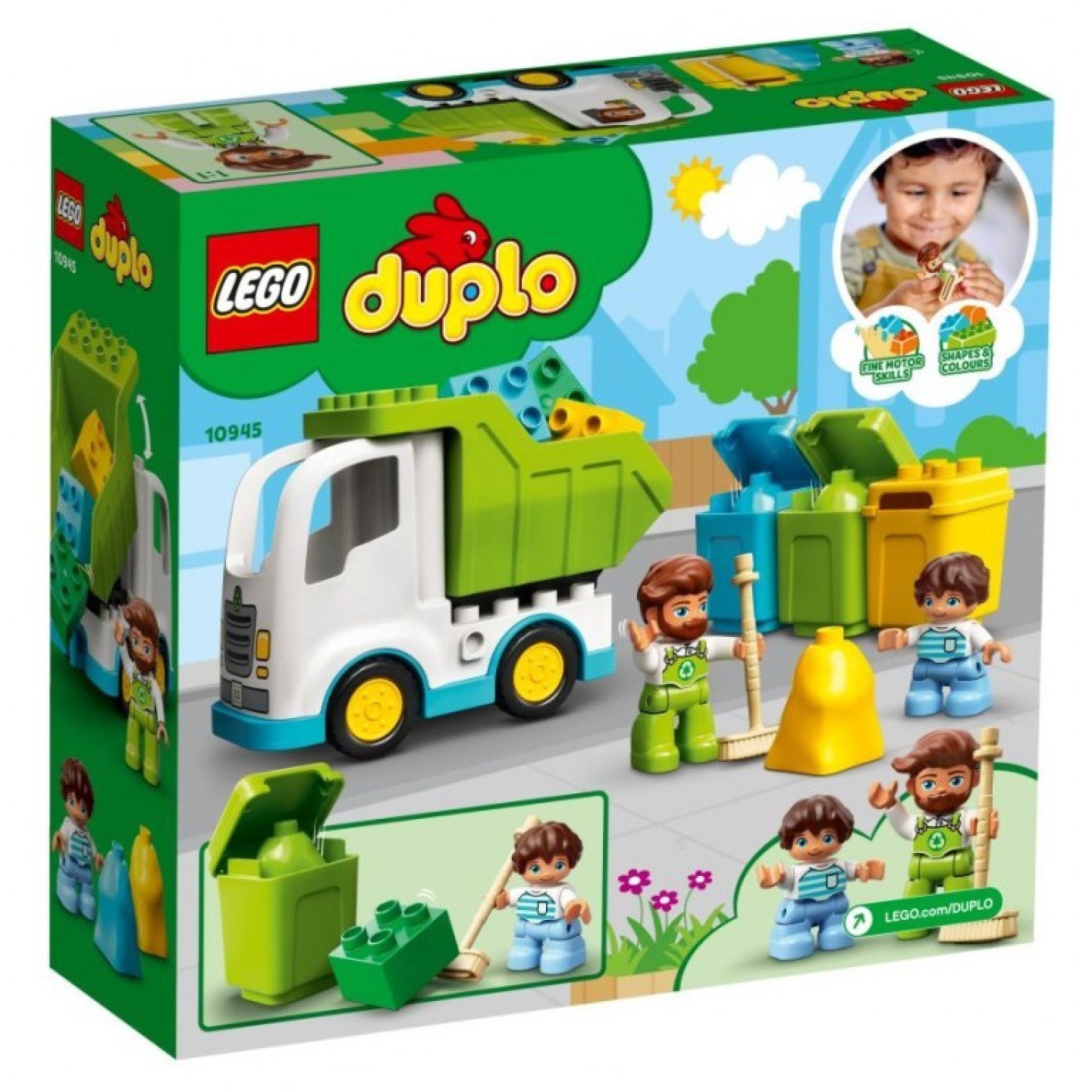 Akční stavebnice na motivy popelářů Děti se připojí ke 2 DUPLO figurkám, s nimiž si užijí hromadu legrace a naučí se spoustu věcí. Budou dávat pytle na odpadky do správných popelnic podle barev, procvičí jemné motorické dovednosti s otevíracími víky a autentickým popelářským vozem, zažehnou jiskru své představivosti při hraní bezpočtu příběhů, zametou odpadky pomocí velkého smetáku a osvojí si ekologický přístup, který jim vydrží po celý život. Tvořivá vzdělávací stavebnice pro nejmenší Hračky LEGO DUPLO dětem nabízí neomezenou zábavu, možnost sebevyjadřování a učení hrou. Díky stavebnicím DUPLO mohou být rodiče u významných vývojových milníků svých dětí, které prožijí, zatímco si budou vychutnávat dlouhé hodiny hraní. Popelářský vůz (10945) z řady LEGO® DUPLO® Město je pestrobarevná a všestranná stavebnice plná funkcí a zábavných aktivit, které děti inspirují k učení hrou. Součástí stavebnice jsou 2 DUPLO® figurky – popelář a chlapec – a pohyblivý vůz s funkcí vyklopení, 3 pytle, které lze dát do odpovídajících popelnic, a navíc také velký smeták. Zatímco si děti budou hrát nápadité příběhy o tom, jak recyklují odpady a nakládají vůz, naučí se rozeznávat barvy, procvičí jemné motorické dovednosti a osvojí si ekologický přístup. Stavebnice plná doplňků a funkcí nabízí bezpočet příležitostí k hravému učení pro děti od 2 let. Rodičům pak dává šanci prožívat významné vývojové milníky společně s jejich předškolákem. Model měří přes 11 cm na výšku, 15 cm na šířku a 7 cm do hloubky a můžete jej neustále přestavovat k obrazu svému nebo kombinovat s ostatními hračkami LEGO® DUPLO®. V návodu na stavění naleznete také zábavný obrázkový příběh, v němž figurují prvky ze stavebnice a který kreativní stavění a hraní obohatí o špetku legrace. Všechny stavebnice LEGO® DUPLO® byly odborně navrženy tak, aby s pomocí nápaditých prvků podněcovaly k neomezenému hraní, které podporuje vývoj a které si mohou děti užívat spolu se svými rodiči. Sady od LEGO® DUPLO® splňují vysoké oborové standardy, takže si můžete být jisti, že je pro malé ručky snadné kostky uchopit, umístit a rozpojit – a je tomu tak již od roku 1969. Kostky a dílky LEGO® DUPLO® pouštíme na zem, zahříváme, drtíme, kroutíme a analyzujeme, abychom zajistili, že splňují přísné normy vztahující se k bezpečnosti dětí.