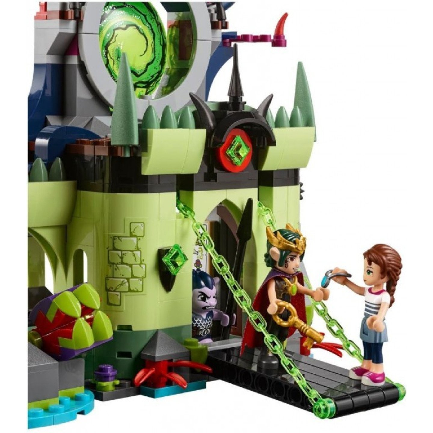 Připoj se k napínavým dobrodružstvím v Elvendale, kde se Emily Jonesové podařilo vplížit do pevnosti Skřetího krále, kam přišla, aby zachránila svou sestru, Sofii Jonesovou. Tato sada obsahuje Emilyin člun s kotevním hákem a pohyblivým kormidlem, navíc je zde pevnost se spouštěcím padacím mostem, tajné dveře za krystaly, vrhající katapult, otáčecí trůn a klec visící nad hladovými rostlinami. Součástí jsou tři minifigurky - panenky a navíc skřet a figurka stínového havrana. Součástí jsou tři minifigurky - panenky: Skřetí král, Emily Jonesová a Sophie Jonesová, navíc skřet Tufflin a figurka stínového havrana. Součástí je dvoupatrová pevnost s věží, otáčecím trůnem, visící klecí, otevírací branou, padacím mostem, pastmi z masožravých rostlin, které lze zavřít, vrhajícím katapultem a kouzelnou knihou, která se otvírá. Součástí je také člun Emily Jonesové s pohyblivým kormidlem a kotevním hákem s „lanem“. Pohybuj kormidlem na člunu a pomoz Emily Jonesové najít cestu do pevnosti. Hoď kotevní hák do horní části pevnosti, vyšplhej po laně a postav se Skřetímu králi. Pověs dobrý a zlý přívěsek, a potom otevři bránu. Otoč kolečkem, spusť padací most a uvolni průchod do pevnosti. Mezi zbraněmi najdeš meč Emily Jonesové a Tufflinovo kopí a štít. Mezi doplňky najdeš hůl Skřetího krále, dva přívěsky, lektvar temné magie, dvě zlá semínka, kuřecí stehýnko, pohár, léčivý lektvar a kápi pro Skřetího krále. Další figurky proradných skřetů můžeš najít ve vybraných sadách LEGO® Elves. Pevnost Skřetího krále měří přes 20 cm na výšku, 28 cm na šířku a 13 cm do hloubky.