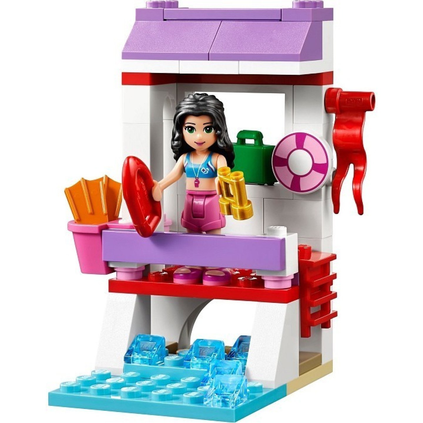 Dohlížej s Emou na bezpečí plavců z věže pobřežní hlídky. Sleduj vlny a rozhodni, kterou vlajku vyvěsit. Červená znamená nebezpečí, zelená že je vše v pořádku. Rozhodni sama! Pak roztáhni růžový slunečník a hraj si s doplňky jako je hrad z písku nebo kyblíček a lopatička. Pak si nazuj ploutve a užívej si s hravým delfínem! Obsahuje minifigurku-panenku Emy s různými doplňky a delfínem.