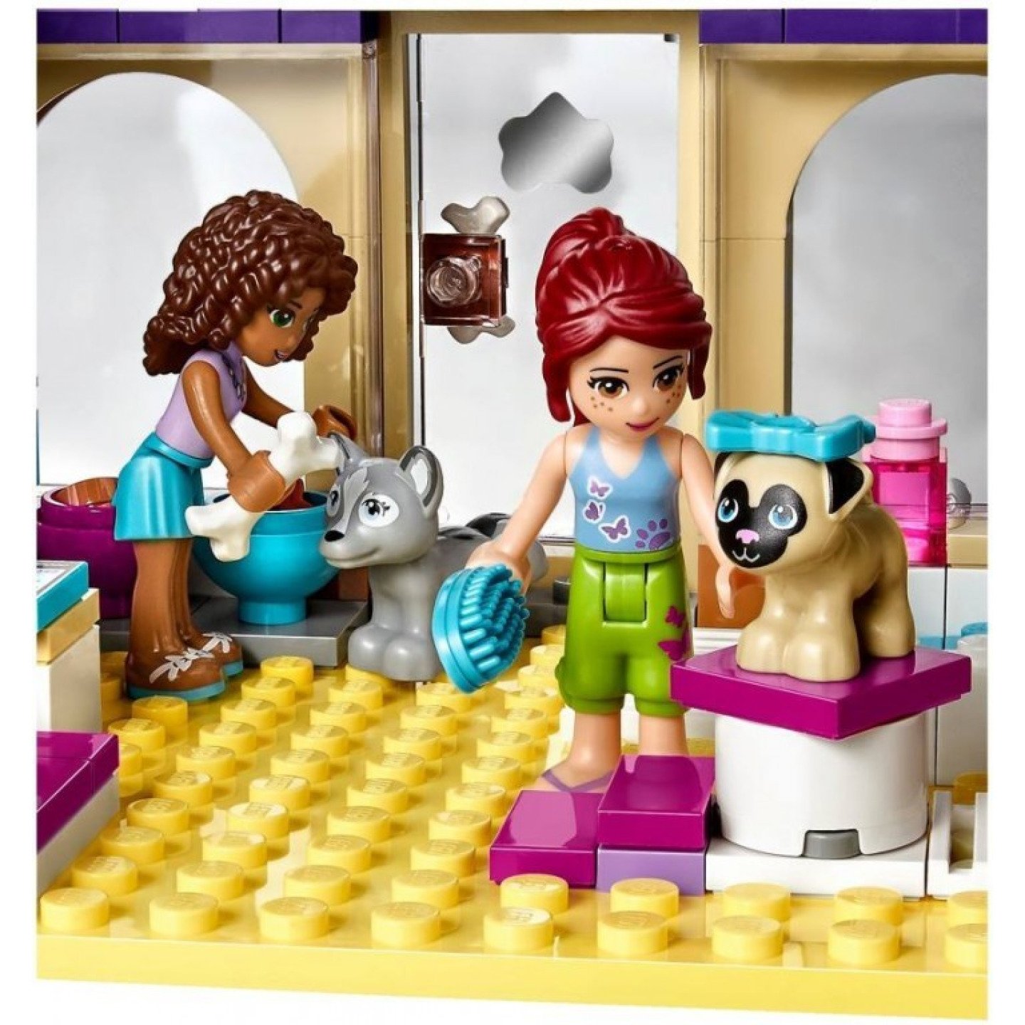 Všichni pejskové z městečka Heartlake si chodí rádi hrát do Andreiny a Miiny stanice pro péči o štěňátka. Probíhej s nimi překážkovou dráhou na zahradě - je to jako hřiště pro štěňátka! Zajdi dovnitř a pořádně ve vaně umyj fenku husky Lunu a mopslíka Toffeeho a potom o ně hezky pečuj. Potom se mohou najíst a odpočinout si ve svých speciálních pelíšcích, zatímco budeš v počítači přijímat nové rezervace. Obsahuje minifigurky-panenky Andrey a Miy, navíc psa husky a mopslíka. Obsahuje budovu péče o štěňátka v Heartlake s otevíracími dveřmi, vanou, stanicí pro česání, krmnou stanicí, psími pelíšky, prostorem pro krmení, prostorem kanceláře a malými dvířky pro psy do zahrady. Zahrada obsahuje překážkovou dráhu se 2 překážkami a otáčecí kolotoč, pódium a fontánu na pití. Mezi doplňky najdeš počítač, telefon, kartáč na česání, psí šampón, mašličky do vlasů, misky na krmení, psí suchary, kosti, požární hydrant, lopatu, kyblík, míček, hůl a trofej. Posaď pejsky před zrcadlo a pořádně o ně pečuj pomocí kartáče, šampónu a mašliček. Přijmi další rezervace a mluv se zákazníky přes počítač a telefon na stanici pro péči o štěňátka. Hraj si se štěňátky na otáčejícím se kolotoči a pomáhej jim přeskakovat překážky v překážkové dráze, aby cvičila. Stanice pro péči o štěňátka v Heartlake měří přes 9 cm na výšku, 19 cm na šířku a 12 cm do hloubky.