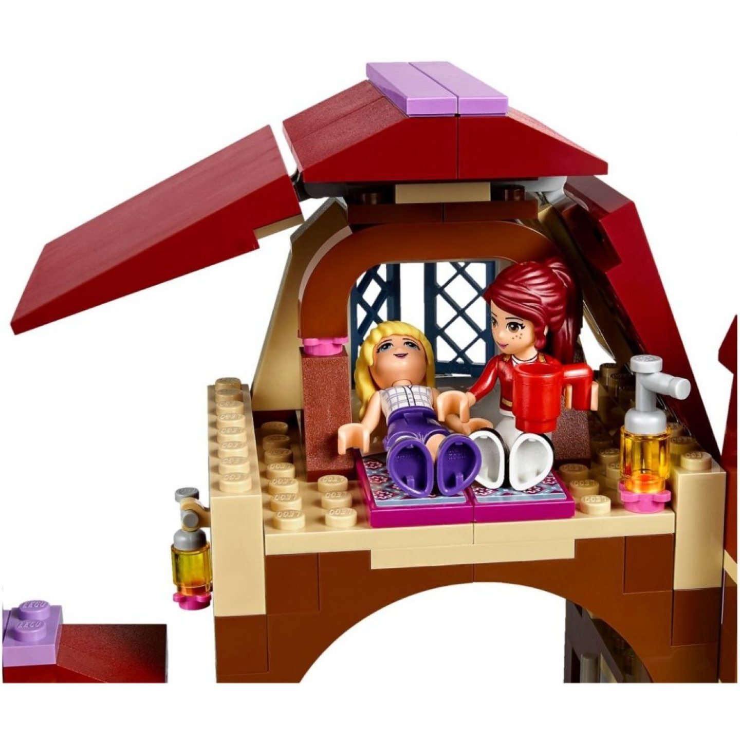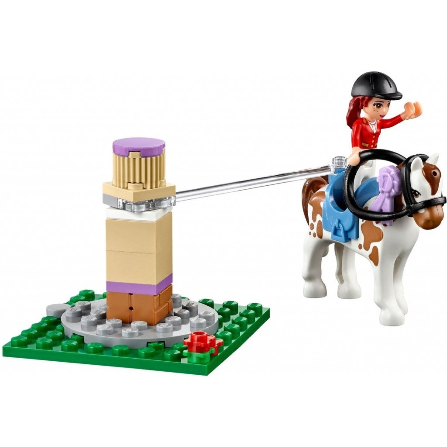 Použij cvičební náčiní a rozehřej poníky, potom piluj skákání - dokonce můžeš laťku dát i výše, až budeš mít pocit, že už ses zlepšila. Hřebelcuj koníky a obleč se v prostoru šatny. Po závodě ulož koníky do pelíšku a bav se s Miou a Stephanie v kavárně jezdeckého klubu, než se uložíš na půdě - zítra se opět začíná brzy ráno! Obsahuje minifigurky-panenky Miu a Stephanie v jezdeckém oblečení, navíc myšku a 2 koníky: 1 černého a 1 bílého s hnědými flíčky. Obsahuje 2-patrovou budovu stájí s otáčecí větrnou korouhví a dvůr s otáčecím nářadím na cvičení, tréninkovou překážkou se 2 možnými výškami skoku, korytem na krmení a na pití, a se stanicí k hřebelcování. První patro obsahuje 2 stáje s otevíracími dveřmi, vstup s vystavenými trofejemi, a šatnu s houpajícími se dveřmi, záchodem, umyvadlem a stojánkem na helmu. Druhé patro obsahuje otevírací okna, kavárnu se stolkem a lavičkami, kde se můžeš najíst, prostor půdy se 2 postelemi a domkem pro myšku. Mezi jezdeckými doplňky najdeš helmy, uzdy, sedla, koňské deky a trofeje. Doplňky k hřebelcování a krmení obsahují kartáče, hřebeny, 3 lahvičky s mýdlem, mašličky do hřívy, kyblík, vidle, seno, jablko a mrkev. Jídelní doplňky obsahují hrnky, talíř, 4 kousky třešňového koláče, 2 kousky melounu, láhev na vodu a sýr pro myšku. Otáčej nářadím na cvičení,abys rozehřál koníky, potom nastav překážku na skákání do správné výšky. Vyndej si sedla a uzdy a po těžkém dni plném tréninku dej na koníky dečky. Odpočívej s kamarády v kavárně a vychutnej si kousek třešňového koláče a hrnek horké čokolády. Koňské stáje měří přes 17 cm na výšku, 32 cm na šířku a 14 cm do hloubky. Zkombinuj se setem Lego 41123 mycí stanicí pro hříbátka a se setem Lego 41125 veterinářským přívěsem pro koně a jeď do prostoru jezdeckého klubu.