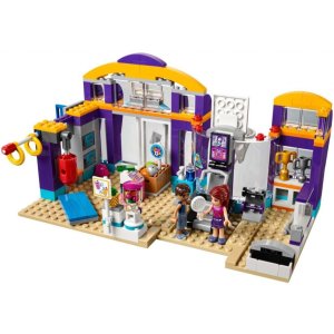 Pořádně si zacvič v LEGO® Friends Sportovním centru v městečku Heartlake. Za posuvnými dveřmi najdeš skříňky, posilovnu s boxovacím pytlem a kruhy pro gymnasty, zdravý bar, pás na běhání a místnost pro cvičení jógy s tyčí na cvičení, závažími a podložkou na jógu. Venku najdeš stojan na kola, fotbalovou branku a basketbal s funkcí střílení do koše. Součástí sady jsou dvě minifigurky-panenky. Součástí jsou minifigurky-panenky Mia a Robert. Obsahuje posuvné dveře, dvě otevírací skříňky, posilovnu s boxovacím pytlem a kruhy pro gymnasty, zdravý bar s mixérem, pás na běhání, místnost na cvičení s tyčí a zrcadlem, basketbal s funkcí střílení, fotbalovou branku, stojan na kola a kolo. Mezi doplňky najdeš míče, bankovku, ananas, láhev na vodu, činky a podložku na cvičení jógy. Pomoz Mie trénovat Roberta v posilovně, který se učí bouchat do boxovacího pytle. Vyndej si podložku na cvičení jógy a dej si jednu lekci. Ozkoušej své dovednosti s funkcí střílení na basketbalový koš. Jdi si zajezdit na kole kolem městečka Heartlake. Tato sada nabízí zážitek z hraní a stavění vhodný pro děti od 6 do 12 let. Zkombinuj se sadou 41313 Letní bazén v městečku Heartlake a získej ještě více možností pro to, jak trávit svůj volný čas. Sportovní centrum měří přes 12 cm na výšku, 23 cm na šířku a 15 cm do hloubky.