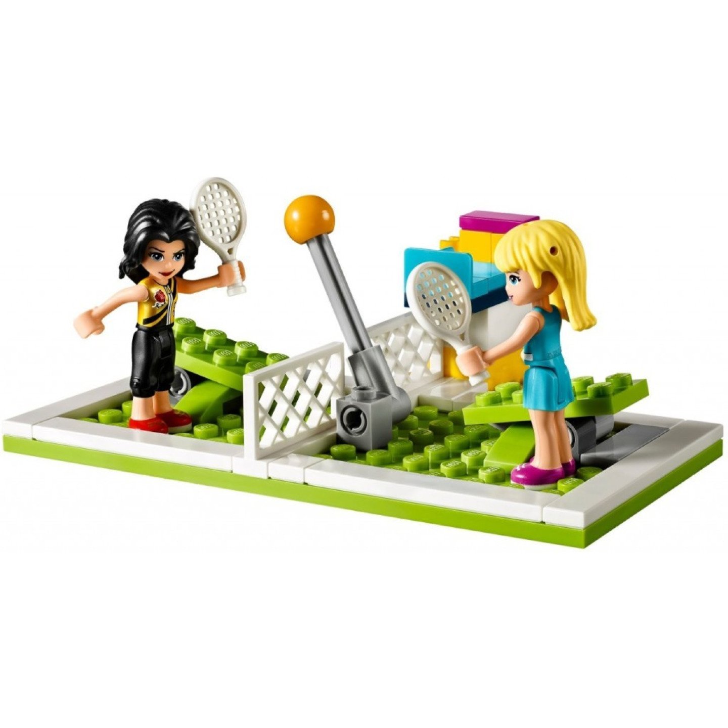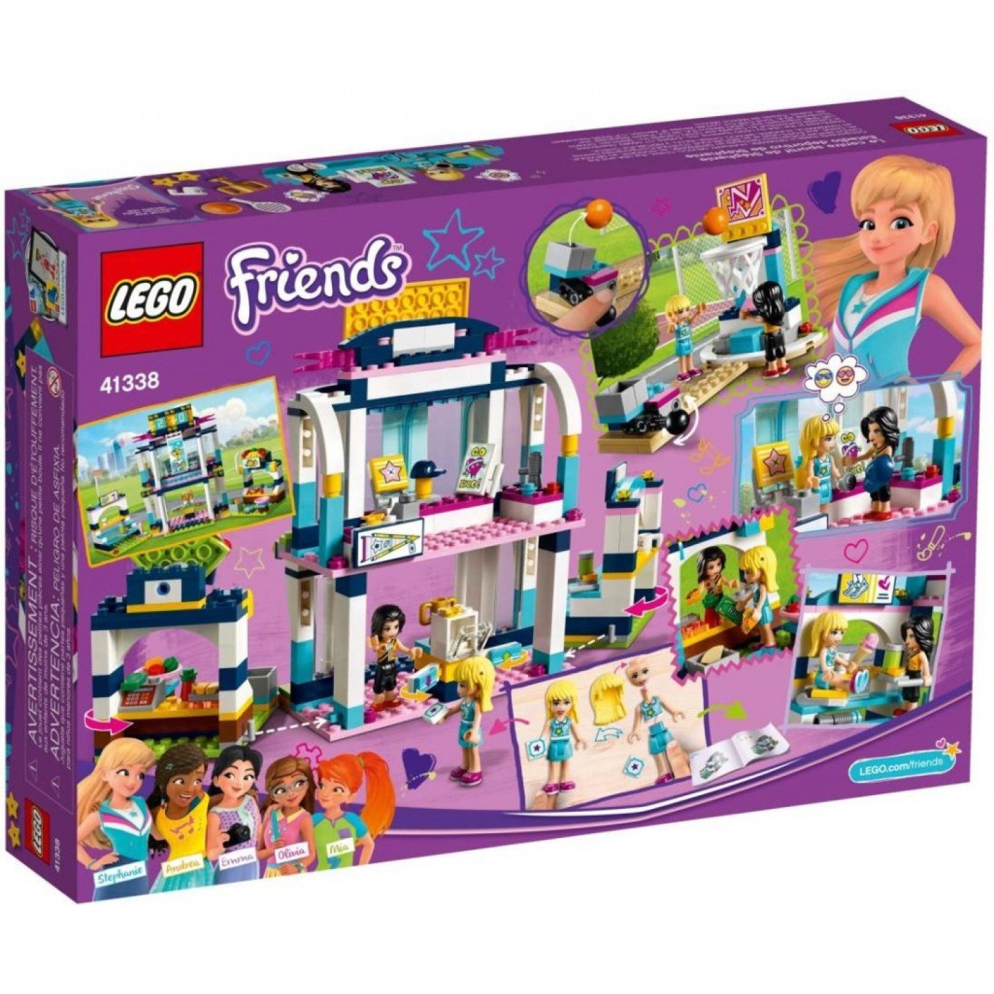 Dej se dohromady se Stephanií, udržuj se v kondici a zkus některé z jejích oblíbených sportů. Projdi hlavním vchodem do basketbalové arény. Trénuj míření a stisknutím tlačítka vystřel basketbalový míč do sítě, pak se posaď na tribunu a sleduj Stephanii, jak válcuje svoji největší tenisovou soupeřku! Po zápase si dej taco a kup si suvenýr v barvách svého týmu v obchodě v horním patře. Obsahuje mini-panenky Stephanie a Vicky. Obsahuje 2patrovou budovu s tabulí pro skóre, hlavní vchod, obchod se suvenýry, otočné hlediště a taco bar pro obě strany, tenis s funkcí pohyblivého míčku, basketbal s funkcí střelby a 2 dekorativní reflektory. Mezi doplňky najdeš 2 tenisové rakety, míč na basketbal, trofej, lahvičku, hrnek „I love Heartlake City“, taco, lahvičku s omáčkou, bankovku, minci, lístek, megafon a kšiltovku. Použij skvělé funkce této úžasné dětské hry a hraj basketbal a tenis ve sportovní aréně. V obchodě si kup suvenýry a vlaječky v barvách svého týmu. Pomoz Stephanii vybojovat vítězství a trofej na tenisovém kurtu proti její soupeřce Vicky. Zjisti, kolikrát střelíš basketbalový míč do koše. Zajdi do baru a kup si výtečné taco a pití. Vezmi si občerstvení do hlediště a sleduj co se děje. Vhodné pro děti od 6 do 12 let. Sportovní aréna spolu s hledištěm a taco barem měří přes 18 cm na výšku, 22 cm na šířku a 8 cm do hloubky. Tenisový kurt měří přes 5 cm na výšku, 12 cm na šířku a 9 cm do hloubky. Basketbalová aréna měří přes 10 cm na výšku, 8 cm na šířku a 13 cm do hloubky. Kombinuj se stavebnicí Stephanie na fotbalovém tréninku 41330 a trénuj ještě víc.