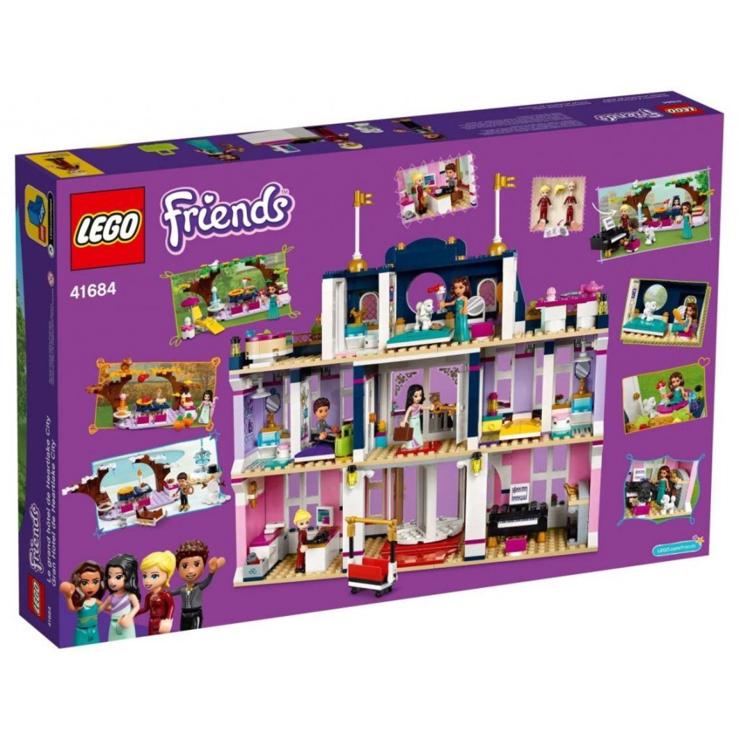 Krásný třípatrový hotel ukrývá řadu kreativních detailů, díky kterým nebude snadné malé stavitele a stavitelky od hraní odtrhnout. Pětihvězdičkový zážitek Stavebnice nabízí spoustu prvků k objevování – bar s pianem, recepci, pokoje s vlastní koupelnou, venkovní posezení i luxusní prostor na střeše. V nabídce samozřejmě nesmí chybět lázeňské a wellness služby. Sada obsahuje minipanenku herečky Amelie, se kterou si děti mohou hrát na přepychový VIP život. LEGO® Friends minipanenky Stephanie, Emma a River pak zastanou role hostů, recepčních nebo hotelových poslíčků. Stavebnice do každého počasí Sada obsahuje sezónní doplňky, které přidávají hraní nový rozměr. Se změnou ročních období je potřeba změnit také výzdobu modelu. Na podzim je možné změnit barvu listů na stromech, k zimě neodmyslitelně patří sněhovékoule, rampouchy a sněhulák a v létě se děti zase mohou těšit z rozkvetlých květin. Dopřejte dětem možnost okusit, jaké to je žít život herecké hvězdy v hotelu v městečku Heartlake (41684) – třípatrové stavbě inspirované francouzskou architekturou se stylovými detaily odrážejícími aktuální roční období. Obsahuje 4 LEGO® Friends minipanenky, včetně filmové hvězdy, a 3 zvířecí figurky. Sada přináší řadu autentických detailů – hotel nabízí celkem 5 pokojů a stylové venkovní posezení. Kreativní děti si užijí hromadu legrace při hraní si na luxusní hotel, ať už v něm budou pobývat nebo pracovat. Mohou také zapojit svou představivost a model upravit v závislosti na ročním období. Perfektní nápad na dárek pro holky a kluky ve věku od 8 let, kteří rádi prožívají skutečné příběhy. Zároveň jde o fantastickou volbu pro děti, které třeba ještě nemají tolik zkušeností se stavěním – tuto stavitelskou výzvu si zaručeně užijí. Model hlavní budovy měří něco málo přes 28 cm na výšku, 28 cm na šířku a 14 cm do hloubky. Díky těmto rozměrům se jedná o stylový výstavní kousek z řady LEGO® Friends. Tento model čítající 1308 dílků jako všechny LEGO® Friends sady obsahuje hromadu autentických doplňků, které zažehnou jiskru dětské představivosti. Dokonce nechybí ani vozík na zavazadla nebo klíče k pokojům! Kreativní sada, která děti zabaví po celý rok. V zimě se mohou těšit na svíčky a sněhové koule, k létu patří květiny a zmrzlina a k podzimu zase zlatavé listí a dýně. Darujte dětem vstupenku do městečka Heartlake. Sady zahrnují parádní modely vozidel a realistických budov i postavy každodenních hrdinů a hrdinek. Jde o perfektní volbu pro děti, které rády prožívají každodenní příběhy. Již od roku 1958 splňují LEGO® hračky náročné oborové standardy a jsou konzistentní a kompatibilní. Sady LEGO® Friends s modely z městečka Heartlake testujeme téměř všemi představitelnými způsoby, takže si můžete být jisti, že každá stavebnice splňuje ty nejvyšší bezpečnostní standardy.