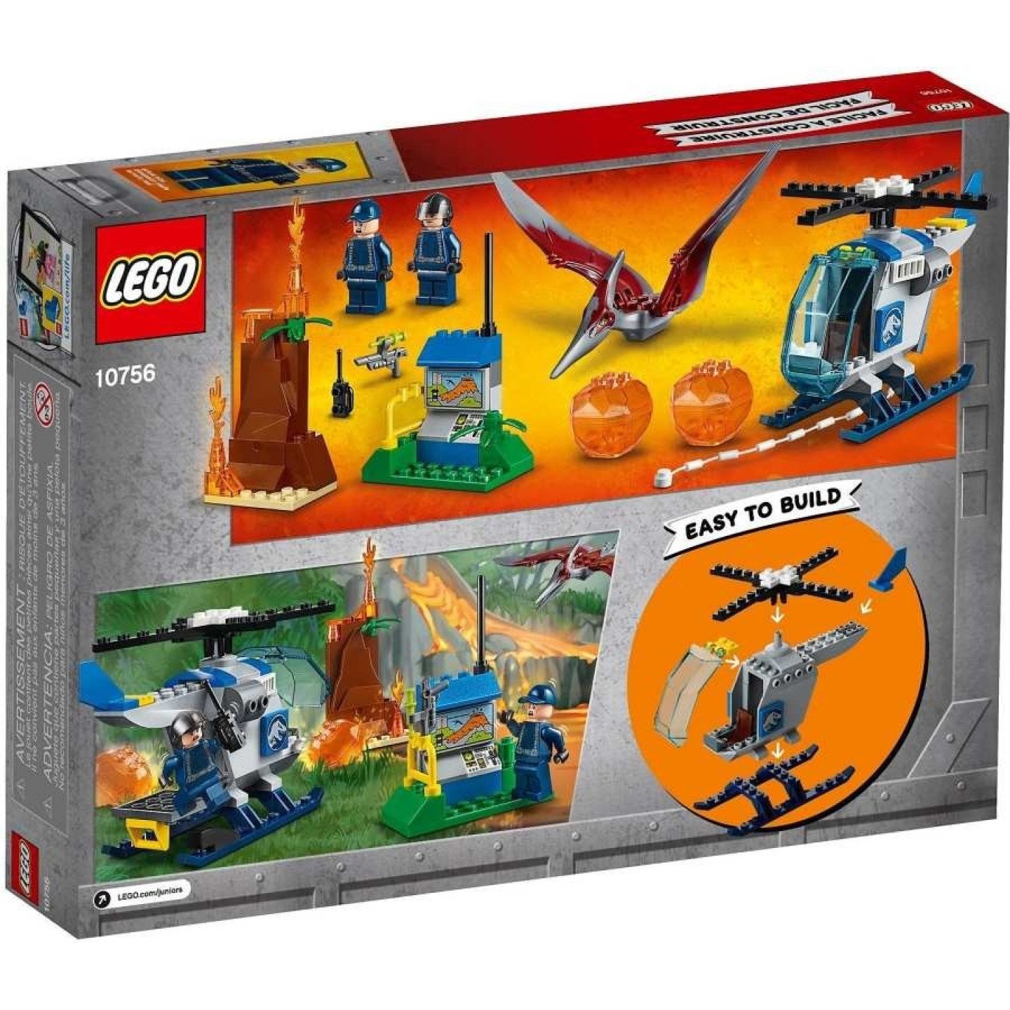 Ukažte svému dítěti, jak napínavé může být zkoumání, s touto sadou Útěk Pteranodona z edice Jurský svět z řady LEGO® Juniors. Sada obsahuje jednoduchou stavebnici vrtulníku se základnou pro rychlý začátek stavění a otočnými vrtulemi, malou sopku se skládacími lávovými kameny a skládacího pteranodona s pohyblivými křídly a zobákem. Tato cool dětská hračka obsahuje také jednoduchý návod na stavění i ke hře, který pomůže budovat sebevědomí dětí od 4 do 5 let. Obsahuje 2 minifigurky a figurku pteranodona. Obsahuje 2 minifigurky: stopaře a pilota. Součástí sady je vrtulník s otočnou vrtulí, lanem a základnou pro rychlý začátek stavění. Obsahuje také malou základnu, malou sopku s lávou a 2 skládacími lávovými kameny a skládací figurku pteranodona s pohyblivými křídly a otevíracím zobákem. Spusť lano z vrtulníku a zachraň stopaře před lávovými kameny. Snes se střemhlav s pteranodonem a pronásleduj vrtulník. Mezi doplňky najdeš uspávací pistoli a vysílačku. Tato cool hračka je vhodná pro děti od 4 let. Součástí sady jsou modely, které se snadno skládají se základnou pro rychlý začátek stavění, a také jednoduchý návod, aby se děti mohly rovnou pustit do stavění a hraní. Sady LEGO® Juniors jsou plně kompatibilní se všemi ostatními sadami LEGO. Vrtulník měří přes 8 cm na výšku, 13 cm na délku a 10 cm na šířku. Pteranodon měří s roztaženými křídly přes 3 cm na výšku, 10 cm na délku a 20 cm na šířku.