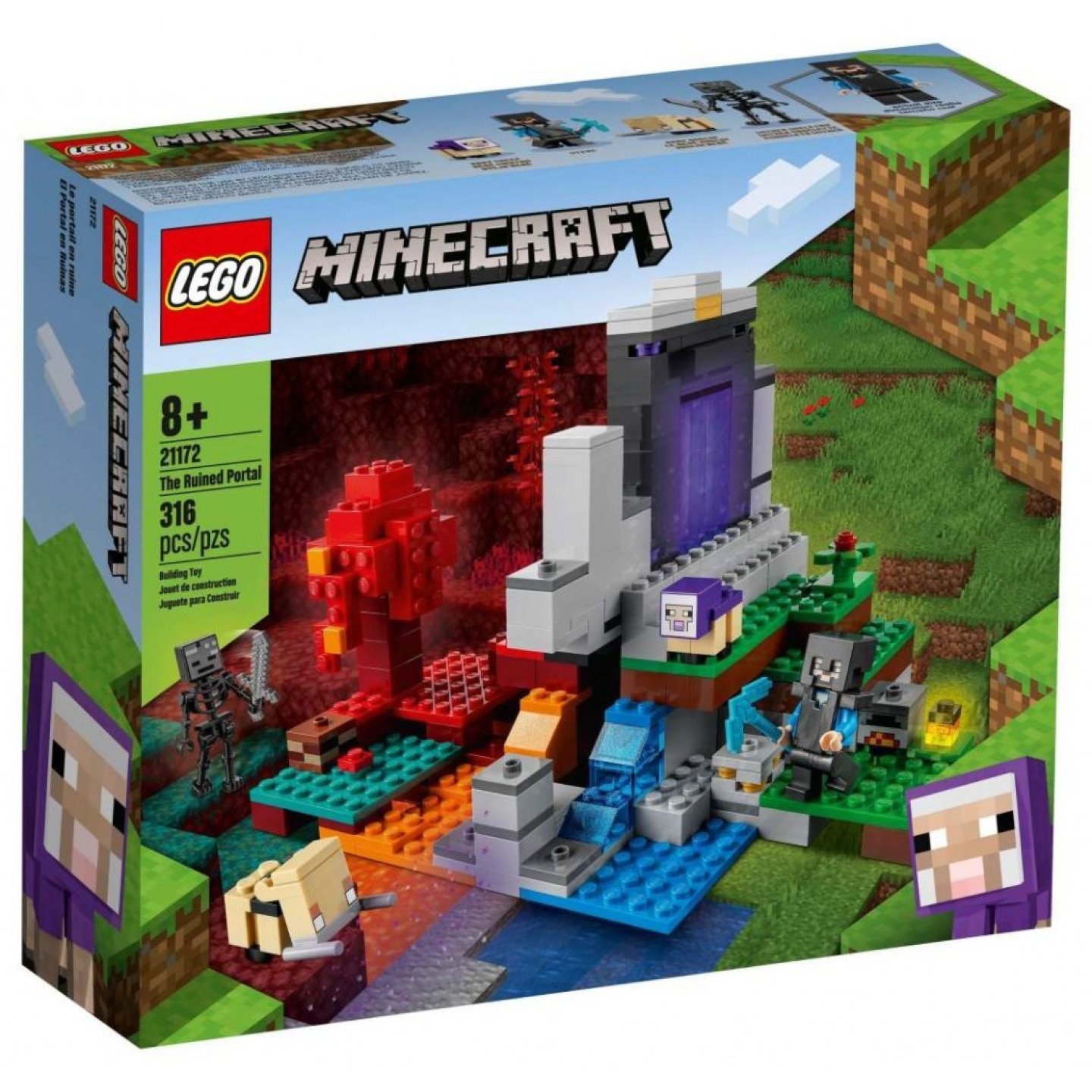 Portál do ohnivého podsvětí v říši Minecraft Děti mají za úkol pomoci Steveovi, kultovní postavě ze světa Minecraft, vytvořit dokonalé brnění. Nejprve ale musí překonat řadu kreativních výzev a absolvovat několik akčních dobrodružství. Tato zábavná stavebnice obsahuje portál, jeden z nejvíce vzrušujících prvků hry Minecraft. Nebezpečnou bránu mezi dimenzemi lze aktivovat a deaktivovat pomocí ručního ovládání. Tento neuvěřitelně fascinující model určitě zabaví příznivce hry Minecraft na dlouhé hodiny. Stavebnice Zničený portál (21172) od LEGO® Minecraft™ provede fanoušky populární online hry starodávným portálem do světa multidimenzionálních dobrodružství, která neberou konce. V sadě nechybí Steve, populární postava ze hry Minecraft™, ale ani další důvěrně známé figurky – jehňátko, hogliní mládě a wither kostlivec – a sestavitelný portál s ručním ovládáním. Děti, které milují hru Minecraft™, si jistě oblíbí i tento dobrodružný portál. Nebezpečná brána mezi dimenzemi se aktivuje a deaktivuje ručně.¨ Skvělý dárek pro fanoušky hry Minecraft™, milovníky akce a dobrodružství a děti od 8 let, které zbožňují kreativní modely. Přestavitelná stavebnice, která měří přes 13 cm na výšku, 21 cm na šířku a 15 cm do hloubky, je vhodná na hraní i na výstavku, a navíc ji lze kombinovat s ostatními sadami od LEGO® Minecraft™. Stavebnice zaujme barevnými modely horního světa a podsvětí z říše Minecraft™, sestavitelným portálem a autentickými doplňky z populární online hry, včetně Steveova netheritového brnění a meče. Stavebnice řady LEGO® Minecraft™ přinášejí fanouškům nový způsob, jak si vychutnat jejich oblíbenou hru. Součástí jsou postavy, scény a funkce tvořené pestrým mixem LEGO kostek a dílků. Již od roku 1958 splňují LEGO® stavebnice náročné oborové standardy kvality tak, aby byly konzistentní, kompatibilní a umožňovaly snadné spojování a rozebírání. LEGO® dílky pouštíme na zem, zahříváme, drtíme, kroutíme a analyzujeme, abychom zajistili, že splňují přísné globální bezpečnostní standardy.