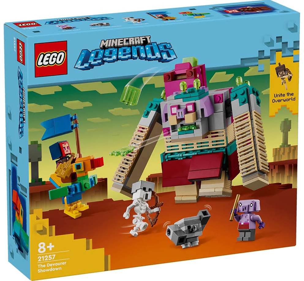 Souboj s Požíračem (21257) je vůbec první model z řady LEGO® Minecraft Legends®. Tato dobrodružná bitevní stavebnice obsahuje tu nejodpornější (a dětmi nejoblíbenější!) akční figurku ze hry Minecraft® a představuje skvělý dárek pro hráče od 8 let. V této stavebnici LEGO Minecraft z nového světa Minecraft Legends najdete jednoho z největších protivníků hry – Požírače. Velká sestavitelná figurka má dlouhé máchající ruce a tělo pokryté strupy, jizvami, boláky a plísněmi. Stisknutím tlačítek Požírač vychrlí „střely“ zvratků z tlamy a hlen z batohu. Součástí stavebnice je figurka Hrdinného lukostřelce s autentickými replikami herních předmětů: vlajkou, pláštěm, diamantovým mečem a loutnou. Lukostřelec si osedlal Velkého zobáka a velí svým spojencům – kostlivci a golemovi z kamenných kostek. S aplikací LEGO Builder se můžete těšit na zábavný digitální zážitek navíc. V ní si lze přibližovat a otáčet modely ve 3D a sledovat postup. Akční figurka ze světa hry Minecraft® pro děti – Souboj s Požíračem je vůbec první stavebnice z řady LEGO® Minecraft Legends®. Děti od 8 let se mohou těšit na spoustu zábavy při stavění, bojování a hraní na jednu z největších postav z videohry Stavebnice s hrdinou – Děti pomůžou Hrdinnému lukostřelci, Velkému zobákovi, kostlivci a golemovi z kamenných kostek v boji proti odpornému Požírači a jeho poskokovi Ohnivému zakrslíkovi, které najdou v této multifunkční stavebnici Minecraft® Akční hraní rolí – Součástí autentické stavebnice ze světa Minecraft® jsou „střely“ v podobě zvratků a hlenu, které lze stisknutím tlačítek vystřelit z úst a batohu Požírače Stavebnice Minecraft® podporuje samostatné hraní – V krabici nechybí doplňky pro Hrdinného lukostřelce: ptáček, kterého si může osedlat, vlajka, plášť, diamantový meč a loutna Tip na dárek pro hráče videoher od 8 let – První stavebnice z řady LEGO® Minecraft®, ve které se objevuje Požírač, se jistě stane hitem mezi fanoušky 3D průvodce stavěním – Děti si mohou stáhnout aplikaci LEGO® Builder a vychutnat si pohlcující stavitelský zážitek s digitálními funkcemi přibližování a otáčení modelů ve 3D a možností ukládání stavebnic a zobrazení postupu ve stavění Minecraft® v reálném světě – Stavebnice LEGO® Minecraft dávají dětem možnost novým kreativním způsobem prožívat oblíbenou hru a postavit si z kostek LEGO známé moby, lokace a předměty Stavebnice pro děti – Model se skládá ze 420 dílků a Požírač měří přes 12 cm na výšku