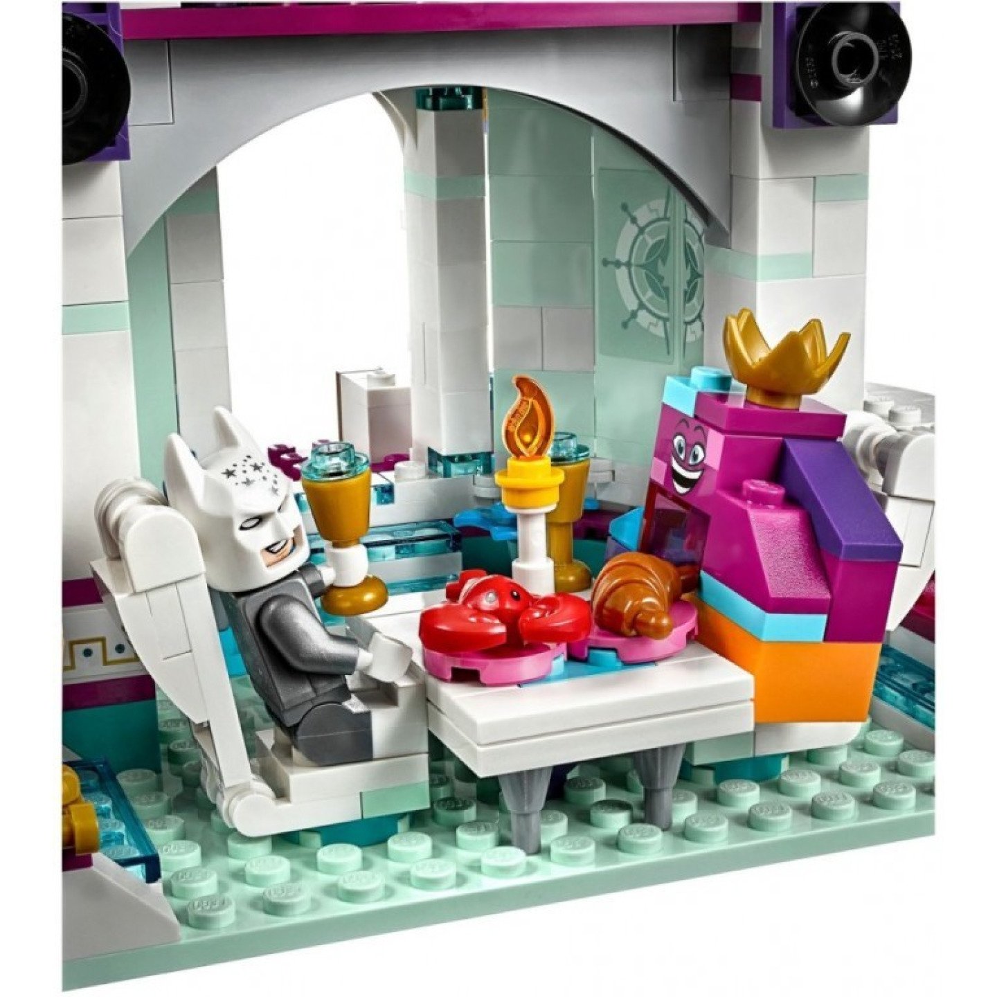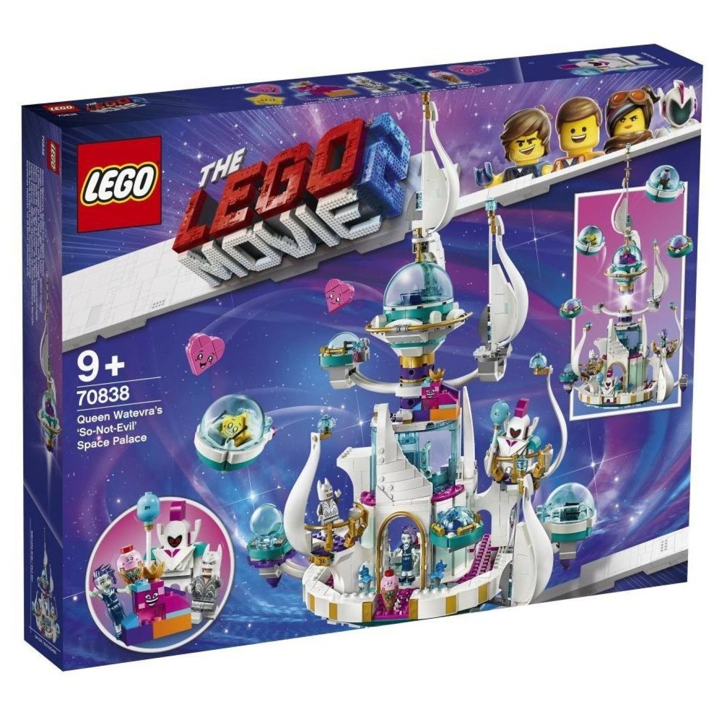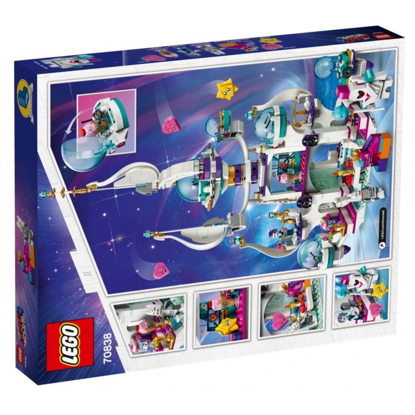 Se sadou 70838 „Hrozivý“ vesmírný palác královny Libovůle se děti mohou těšit na vesmírná dobrodružství, zatímco si budou hrát s oblíbenými postavami z filmu LEGO® PŘÍBĚH 2. Tento barevný LEGO palác obsahuje rotující horní část s otevírací, odnímatelnou raketou pro královnu Libovůli, odnímatelné moduly pro další postavy, bezpečnostní místnost, propracovanou jídelnu a mixážní pult pro kreativní hraní. Jedná se o skvělou stavebnici pro děti a všechny fanoušky filmu LEGO PŘÍBĚH 2, kteří si rádi přehrávají své oblíbené scény a chtějí si vymýšlet vlastní příběhy s minifigurkou, minifigurkou - panenkou a 6 figurkami z kostek. Tato LEGO® sada s palácem obsahuje 8 postav z filmu LEGO PŘÍBĚH 2: minifigurku starého mládence Batmana a minifigurku-panenku Celestýny, a k tomu navíc figurku královny Libovůle, zmrzlinového kornoutu, Hvězdy, královské stráže a 2 sestavitelné fukurky Srdce. Několikapatrový palác obsahuje otočnou horní část s otevírací, odnímatelnou raketou pro královnu Libovůli, odnímatelné otevírací moduly pro ostatní postavy, 2 balkóny, bezpečnostní místnost se skládací bezpečnostní obrazovkou a různými prvky, včetně šálku na kávu, malého srdíčka a koblihy, jídelny se stolem, 2 židlemi, kredencí, skládacím koktejlovačem, různými potravinami a nápoji a mixážním pultem. Obsahuje také sestavitelné lízátko královské stráže. Mezi novinky pro květen 2019 patří minifigurka starého mládence Batmana (se speciálně zdobeným oblekem), minifigurka-panenka Celestýny, figurka královny Libovůle (malá verze), zmrzlinového kornoutu a královské stráže. Děti si mohou díky této parádní sadě s palácem přehrávat zábavné scény z filmu LEGO® PŘÍBĚH 2. Palác měří přes 48 cm na výšku, 34 cm na šířku a 18 cm do hloubky.