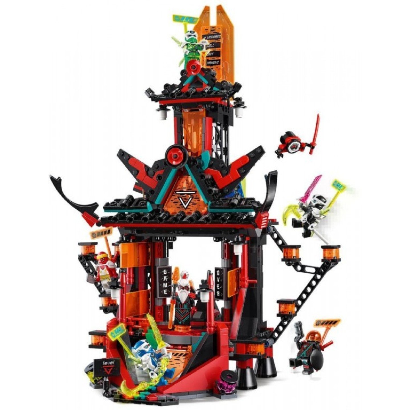 Chrám od LEGO® NINJAGO® nabízí tvůrčím dětem nejrůznější aktivity a napětí. Budou totiž muset přijít na to, jak se dostat až na jeho střechu. Malí hrdinové se musí vyhnout pastím a použít speciální meče key-tana, aby obešli obávaného Sushimiho v jeho suši kuchyni, než otevřou bránu a odhalí Unagamiho trůn. Stavebnice od LEGO® NINJAGO® představují ty nejlepší dětské hračky, protože otevírají bránu do fantastického světa nepřetržité akce, kde mohou malí hrdinové bojovat po boku svých nindža kamarádů proti zlým silám. Fanoušci seriálu NINJAGO® budou uchváceni herními možnostmi akčních sad, včetně nindžovských chrámů, sestavitelných modelů, aut, draků a dalších prvků. Neuvěřitelná stavebnice s chrámem od LEGO® NINJAGO® nabízí vzrušující pasti a funkce, a k tomu navíc 6 minifigurek ze světa Prime Empire. Díky tomu se jedná o perfektní dárek pro děti, které si rády přehrávají příběhy s týmem nindža hrdinů. Tato stavebnice obsahuje chrám ze seriálu NINJAGO® a 6 minifigurek, včetně digitální verze Jaye, Lloyda a Colea od NINJAGO, a k tomu navíc padouchy Unagamiho, „rudou helmu“ a Sushimiho. Děti jistě rády využijí možnost zapojit svou kreativitu a přehrávatsi bitvy. Tento dokonale propracovaný model chrámu nabízí hodiny vzrušující zábavy pro děti, které budou mít za úkol vyhnout se všem pastím a obejít obávaného Sushimiho, aby mohly použít tři speciální meče key-tana a odkrýt Unagamiho trůn v horní části. Tento model chrámu s 810 dílky je parádní stavebnicí pro kluky a holky ve věku od 9 let a představuje skvělý LEGO dárek k narozeninám, Vánocům nebo jakékoli jiné příležitosti. Tato dobrodružná sada, která je novinkou pro leden 2020, má ideální velikost na to, abyste si s ní mohli hrát doma nebo si ji hrdě vystavit na poličce v pokojíčku. Chrám měří 38 cm na výšku, 22 cm na délku a 28 cm na šířku. Tato nindžovská stavebnice se obejde bez baterií – je připravena na nezávislé hraní nebo společnou zábavu s kamarády ihned po sestavení. S těmito dobrodružnými modely se akce nezastaví ani na vteřinu. Tato nindžovská stavebnice je ideální pro děti, které při sestavování tohoto parádního akčního modelu použijí srozumitelný návod. Stavebnice pro děti od LEGO® NINJAGO® podporují jejich kreativitu a umožňují jim utéct do vzrušujícího světa plného dobrodružství, kde mohou spojit své síly s oblíbenými nindža hrdiny a věnovat se nekonečným zábavným a strhujícím bitvám. LEGO® kostky použité v této stavebnici splňují ty nejvyšší oborové standardy již více než 60 let, což zaručuje, že jsou vždy konzistentní, kompatibilní a umožňují snadné rozebírání. Ani Unagami je neporazí! LEGO® kostky použité v této akční sadě prošlypřísnými testy a splňují ty nejvyšší globální standardy týkající se bezpečnosti a kvality. Při výběru LEGO hraček jako dárku pro vaše dítě víte, že jste ve správných rukou.