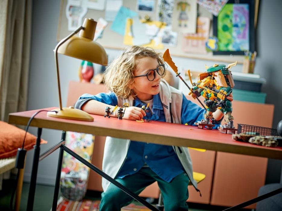 Děti od 9 let se stavebnicí Lloyd, Arin a jejich tým nindža robotů (71794) mohou znovu prožít scény z televizního seriálu NINJAGO® Dračí povstání. V této zcela nové stavebnici najdete roboty, kteří patří mistrovi nindžovského umění Lloydovi a jeho studentovi Arinovi, které můžete spojit do jednoho většího, silně ozbrojeného robota a hrát si donekonečna. 5 minifigurek pro epické bitvy Stavebnice s roboty obsahuje 5 minifigurek. Mistr nindžovského umění Lloyd je ozbrojen 2 katanami a jeho učedník Arin má 2 katany a vystřelovací hák. Mohou se postavit zlému Raptonovi, který je ozbrojený císařským mečem, veliteli císařské stráže s holí a císařskému generálovi s císařským mečem. Stavebnice nabízí dětem vše, co potřebují k přehrávání spousty bojů nabitých akcí. Aplikace LEGO® Builder Nechte se s dětmi vést aplikací LEGO Builder a užijte si snadné a intuitivní stavitelské dobrodružství. Přibližujte a otáčejte modely ve 3D, ukládejte své stavebnice a sledujte svůj postup. Unikátní herní stavebnice se 2 roboty – Stavebnice Lloyd, Arin a jejich tým nindža robotů (71794) fanouškům od 9 let umožní znovu prožít tréninkové a bitevní scény z televizního seriálu NINJAGO® Dračí povstání 5 minifigurek – Součástí nindžovské stavebnice je mistr nindžovského umění Lloyd a jeho učedník Arin, který se postaví Raptonovi, veliteli císařské stráže a císařskému generálovi Zkombinujte 2 polohovatelné roboty – Děti mohou vůbec poprvé spojit 2 roboty a vytvořit jednoho většího, silně ozbrojeného robota – stačí, když Arinova robota připevní hrudníkem k Lloydově robotovi Ještě více akce s nindži – Omrkněte také stavebnici Sora a její transformační motorobot (71792), Chrám dračích energetických jader (71795) a další z řady LEGO® NINJAGO® Stavějte a hrajte si – Tato stavebnice čítající 764 dílků fanouškům nindžů přinese zábavný stavitelský zážitek, úchvatný boj dobra proti zlu a skvěle poslouží jako dárek k narozeninám či jakékoli jiné příležitosti Kousek na výstavku – Roboti po spojení měří přes 28 cm na výšku a mezi jednotlivými bitvami si mohou děti model vystavit v pokojíčku Nový způsob stavění – Proveďte děti na jejich příštím stavitelském dobrodružství intuitivní aplikací s návodem LEGO® Builder. Umožní jim ukládat si stavebnice, sledovat postup a přibližovat a otáčet modely ve 3D, zatímco na nich pracují Prémiová kvalita – Kostky LEGO® už více než šest desetiletí vyrábíme tak, aby je bylo možné vždy bezpečně spojovat Vždy v dobrých rukou – Stavebnice LEGO® splňují přísné globální bezpečnostní normy