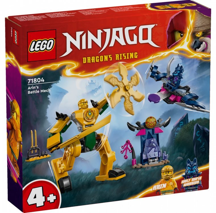 Se stavebnicí Arinův bojový robot (71804) si děti od 4 let procvičí skládání kostek a připojí se k hrdinům ve snaze zachránit jejich dračí přátele. Součástí této akční stavebnice je úchvatný robot, se kterým si děti připomenou strhující dobrodružství z 2. řady televizního seriálu NINJAGO® Dračí povstání. Součástí této stavebnice LEGO® jsou 2 minifigurky: Arin s katanou a válečník s vlčí maskou s mečem. Arin se vejde do pohyblivého robota s velkým mečem a otáčející se čepelí a válečník s vlčí maskou dokáže létat na kluzáku s pohyblivými křídly, vystřelovačem disků a 2 oštěpy. Nechybí ani křišťálová jeskyně z kostek, ve které najdete palici roztříštění a stojan na zbraně se 2 zlatými katanami. Tato stavebnice s nindži byla navržena pro děti od 4 let, které se teprve seznamují s kostkami LEGO. Nechybí začátečnická kostka, jež představuje částečně sestavenou základnu, a děti se tak mohou bez zaváhání pustit do stavění. Nindžovská hračka pro začínající stavitele – Děti od 4 let s akční stavebnicí Arinův bojový robot objeví radost ze stavění a vychutnají si příběhy s nindži Pohyblivý robotický oblek – Děti si s touto stavebnicí robota s kokpitem, pohyblivými končetinami, otáčející se čepelí a velkým mečem připomenou bitvy z 2. řady televizního seriálu NINJAGO® Dračí povstání 2 minifigurky LEGO® NINJAGO® – Součástí nindžovské stavebnice je minifigurka Arina s katanou a válečníka s vlčí maskou a mečem, se kterými si děti užijí nekonečné souboje Letec a křišťálová jeskyně – Součástí stavebnice je letec s pohyblivými křídly, vystřelovačem disků a 2 oštěpy, křišťálová jeskyně s palicí roztříštění a stojanem na zbraně se 2 katanami Nindžovský dárek – Tato zábavná kreativní stavebnice LEGO® poslouží jako krásný dárek pro děti od 4 let a představuje skvělý způsob, jak v malých stavitelích rozvíjet představivost a schopnost vyprávění příběhů Objevte další stavebnice pro děti – Nenechte si jít další stavebnice NINJAGO® (prodávají se samostatně) s draky, roboty a legendárními nindži Úvod do světa kostek LEGO® – Stavebnice LEGO z edice 4+ pomohou dětem seznámit se stavěním z kostek – a samozřejmě se může přidat i zbytek rodiny⁠ Rozměry – Tato stavebnice LEGO® se skládá ze 104 dílků a součástí je robotický oblek, který měří přes 10 cm na výšku