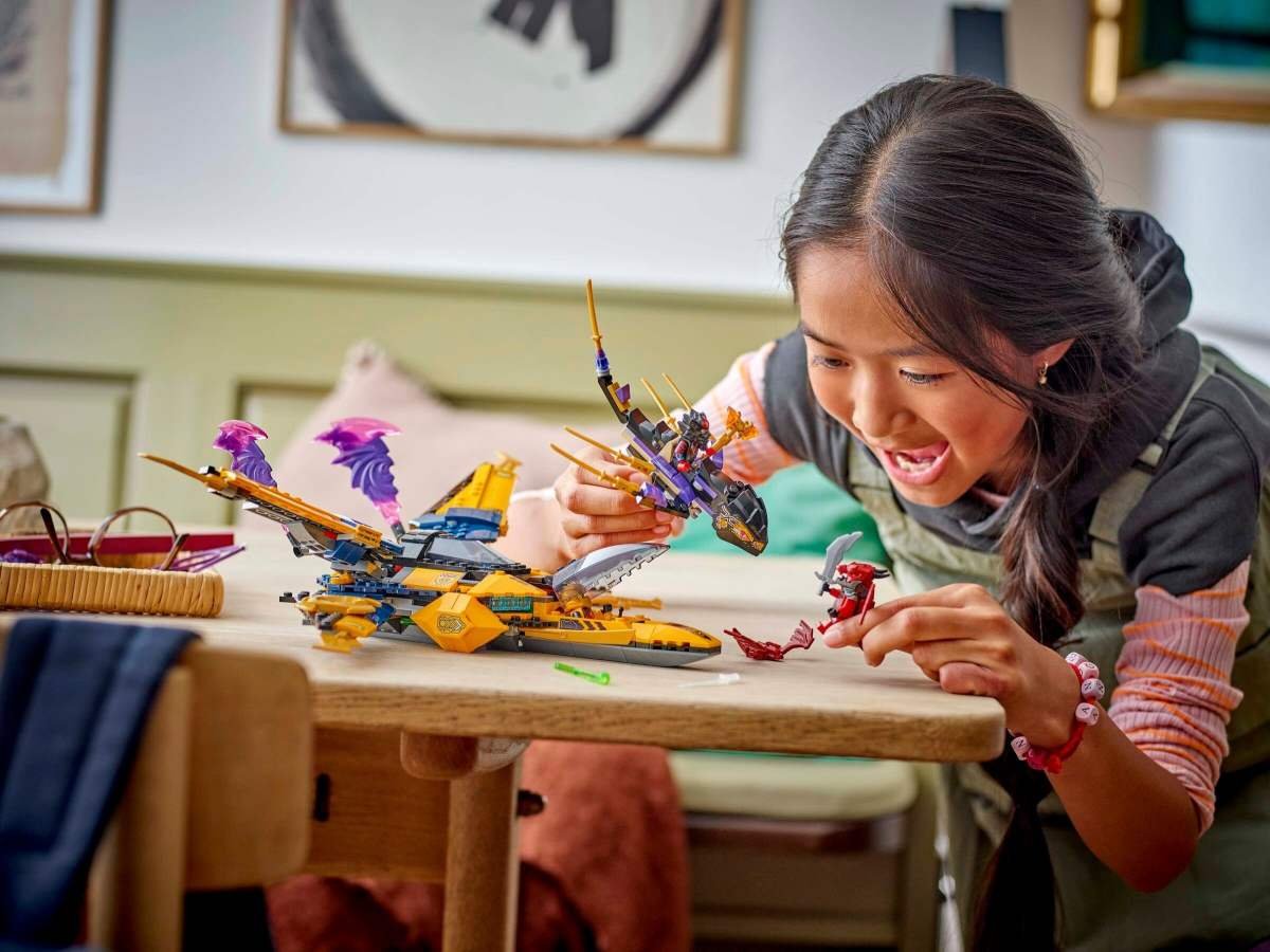 Kluci a holky od 8 let si se stavebnicí Ras, Arin a superbouřkové letadlo (71833) připomenou scény ze 3. řady televizního seriálu NINJAGO® Dračí povstání. Tato úchvatná stavebnice LEGO® obsahuje parádní letadlo s odnímatelným dronem a únikovým modulem, minifigurky Arina, Rase a dračího bojovníka a mini model dračího tvora a děti se tak můžou těšit na nekonečné hodiny hraní na postavy. Tato úžasná akční stavebnice obsahuje odnímatelný dron s dračí hlavou s odnímatelnými čepelemi a motory, které lze použít jako zbraně, 2 kokpity, včetně jednoho, který lze odpojit a použít jako létající únikový modul s křídly, 2 pružinové vystřelovače, nastavitelná křídla a vlnící se bouřné čepele. V dalších stavebnicích z řady LEGO NINJAGO se sestavitelnými hračkami s nindžovskou tematikou (prodávají se samostatně) najdete draky, vozidla a chrámy a fanoušci si užijí hodiny zábavného hraní se svými oblíbenými hrdiny. Aplikace LEGO Builder vám a vašemu dítěti ukáže snadnou a intuitivní cestu stavitelským dobrodružstvím. Hračka s letadlem pro děti – Děti od 8 let si s dobrodružnou stavebnicí Ras, Arin a superbouřkové letadlo připomenou vzdušnou akci z 3. řady televizního seriálu NINJAGO® Dračí povstání Kombo stavebnice nindža vozidla – Model letadla obsahuje odnímatelný dron s dračí hlavou a 2 kokpity, včetně jednoho, který lze odpojit a použít jako létající únikový modul s čepelovými křídly Spousta funkcí – Stavebnice Ras, Arin a superbouřkové letadlo má 2 pružinové vystřelovače, nastavitelná křídla, vlnící se bouřné čepele a odnímatelné čepele a motory, které lze použít jako nindžovské zbraně 3 minifigurky NINJAGO® – Součástí stavebnice je Arin s křišťálovou katanou, Ras se zlatým kladivem, dračí bojovník a model miniaturního dračího tvora Narozeninový dárek pro děti – Tato akční hračka představuje zábavný stavitelský a herní zážitek a poslouží jako skvělý dárek pro děti, které milují nápadité hraní a dobrodružné stavebnice Ještě větší dobrodružství s nindži – Prohlédněte si další stavebnice LEGO® NINJAGO® (prodávají se samostatně) a užijte si se sadou Ras, Arin a superbouřkové letadlo ještě větší porci zábavy Svět nindžů – Se stavebnicemi LEGO® NINJAGO® se děti ponoří do fantastického dobrodružného světa s oblíbenými nindžovskými hrdiny Rozměry – Stavebnice LEGO® Ras, Arin a superbouřkové letadlo se skládá z 510 dílků a měří přes 11 cm na výšku, 33 cm na délku a 38 cm na šířku