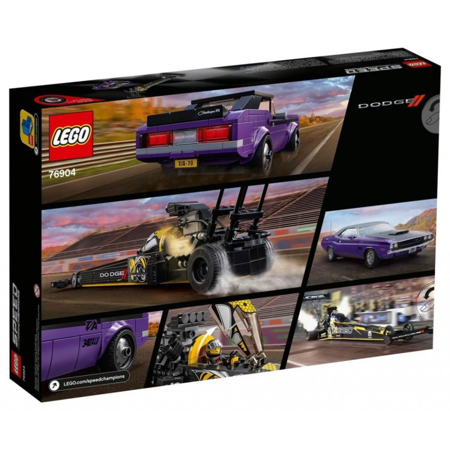 Repliky, které se pyšní spoustou realistických detailů, zaručí obohacující stavitelský zážitek, a navíc jsou skvělé jak k závodění, tak na výstavku. Zábava spočívá v detailech! Sběratelské modely aut v této stavebnici jsou vybavené širokým podvozkem, což jim umožňuje pojmout spoustu detailů. 2 minifigurky jezdců se závodnickou výbavou a helmami pak slibují nezapomenutelnou závodní akci! Prožijte akci v den závodu! Stavebnice LEGO Speed Champions přináší mini verze nejznámějších a nejvýkonnějších vozidel. Děti a fandové do aut tak mohou sbírat, stavět a vystavovat oblíbená vozidla nebo se mohou sejít s kamarády a uspořádat vzrušující závod replik z řady Speed Champions. Úchvatná stavebnice Mopar Dodge//SRT Top Fuel Dragster a 1970 Dodge Challenger T/A (76904) od LEGO® Speed Champions je skvělá pro všechny, kteří milují neobyčejná auta a vzrušující závody. Co vás čeká v krabici? Vše, co budete potřebovat k sestavení vlastních modelů vozů Mopar Dodge//SRT Top Fuel Dragster a 1970 Dodge Challenger T/A, a navíc 2 minifigurky jezdců s oblečením Dodge a závodnickými helmami. Děti a nadšenci do aut se během stavění zblízka seznámí se 2 vozidly Dodge a pak si je vystaví, aby nadchli kamarády, nebo vyrazí na úžasné závody Speed Champions. Model od LEGO® Speed Champions, který se skládá z 627 dílků, skvěle poslouží jako narozeninový či jakýkoli jiný dárek pro holky a kluky od 8 let a všechny milovníky výkonných aut a dragsterů. Mopar Dodge//SRT Top Fuel Dragster je přes 4 cm vysoký, 35 cm dlouhý a 7 cm široký. 1970 Dodge Challenger T/A je přes 5 cm vysoký, 16 cm dlouhý a 7 cm široký. Tato stavebnice nevyžaduje žádné baterie. Vůz pohání dětská představivost – takže závodění nebude brát konce! Plánujete pořídit tuto stavebnici vozů Dodge někomu, kdo je ve stavění LEGO® modelů nováčkem? Bez obav! Součástí sady je srozumitelný, podrobný návod pro oba modely. Stavebnice LEGO® Speed Champions dávají dětem a všem fandům aut příležitost na vlastní kůži prozkoumat některé z nejzajímavějších vozů světa prostřednictvím autentických replik, které jsou jako dělané na vystavení a k nápaditému hraní. LEGO® kostky splňují ty nejvyšší oborové standardy již od roku 1958, což zaručuje, že jsou vždy konzistentní, kompatibilní a umožňují snadné rozebírání. Sady LEGO® Speed Champions procházejí důkladnými testy, abyste měli jistotu, že každý výrobek splňuje přísné bezpečnostní normy.