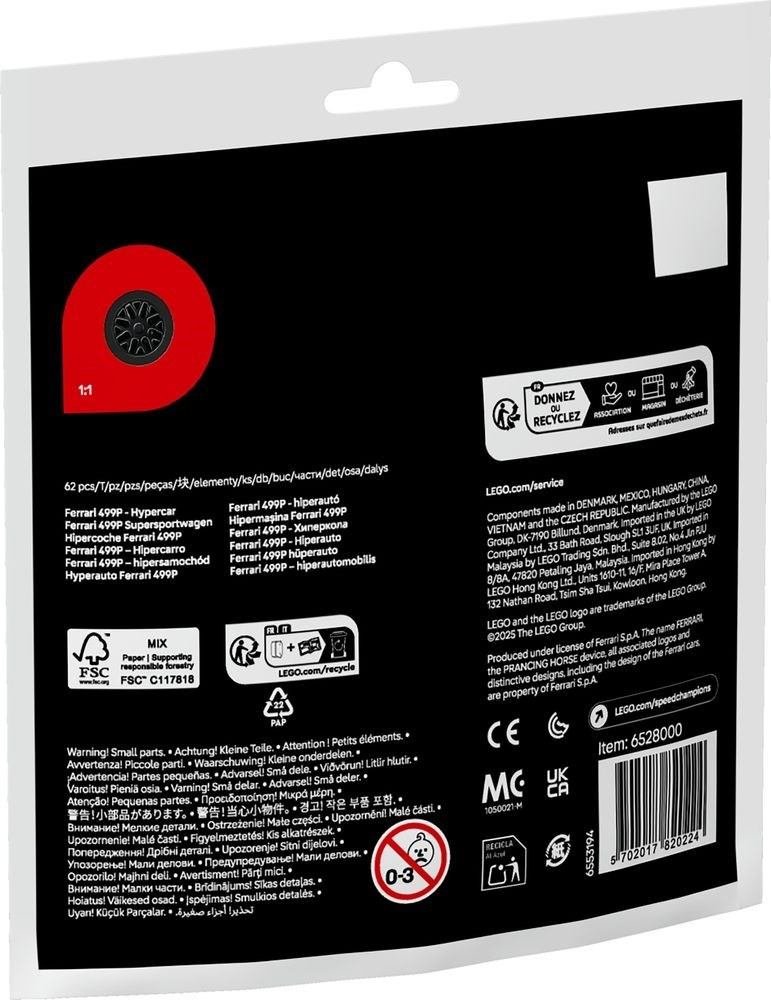 Hybridní hypervůz disponuje pohonem všech kol podobně jako budoucí konkurenti v LMH Toyota a Peugeot. Základ pohonného ústrojí tvoří dvakrát přeplňovaný šestiválec, který spolupracuje s elektromotorem na přední nápravě. Spalovací motor sdílí stejnou architekturu s tím, který má pod kapotou další nový závodní speciál Ferrari 296 GT3. Celkový výkon hypervozu je 500 kW. Design Ferrari 499P načrtly zcela pochopitelně požadavky spojené s aerodynamikou. Proud vzduchu obtéká vysoko vytažené podběhy, prožene se plochami kolem kokpitu a zároveň protéká chladiči pod karoserií, lamely snižují tlak uvnitř podběhů. Vzhled přídě je definován expresivními světlomety a zřetelně se tu uplatnily také designové prvky vycházející z Ferrari Daytona SP3. Na zádi se podařilo naplnit technické požadavky i designové ambice – dvojité vodorovné křídlo je zdůrazněno světelnou lištou, která vytváří impozantní ohnivý efekt. Exkluzívní sběratelský sáček LEGO® Speed Champions - Ferrari 499P - Hypercar.