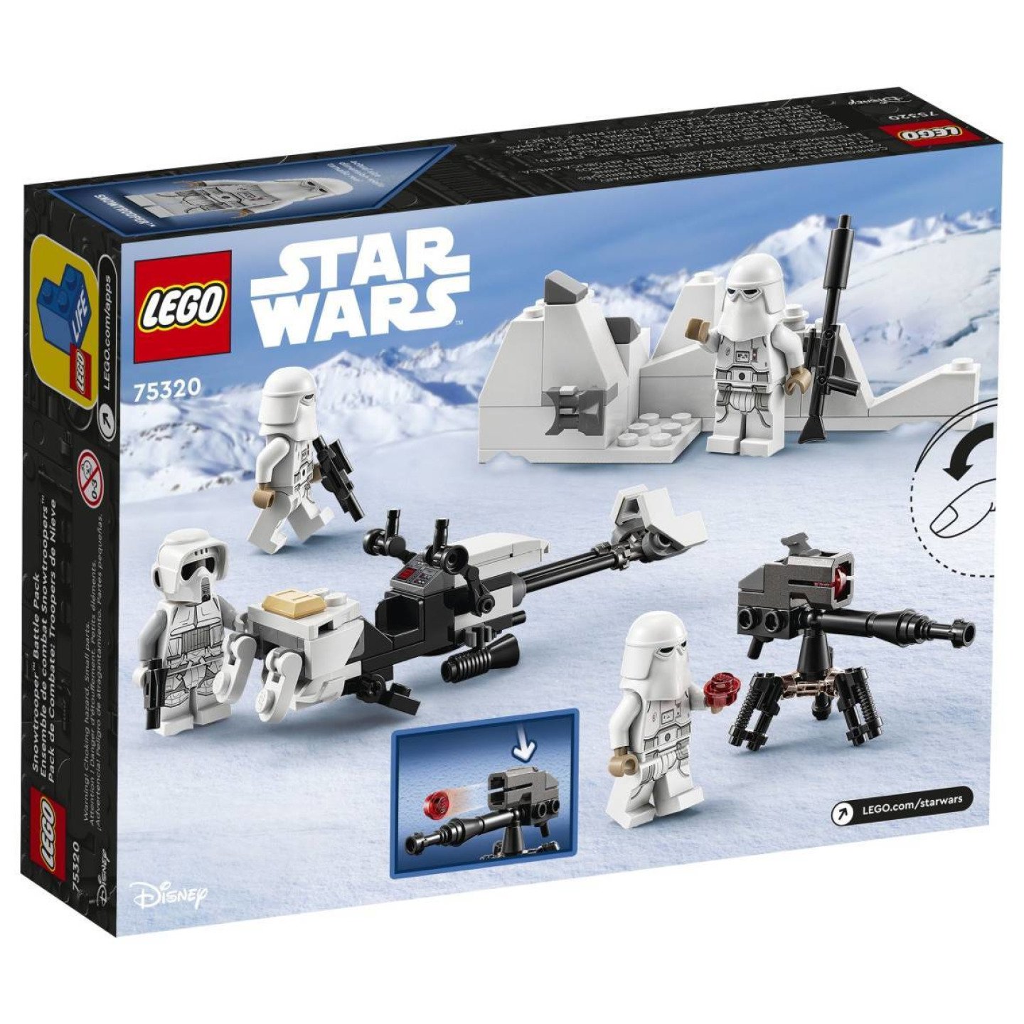 Umožněte malým fanouškům postavit si vlastní armádu a prožít znovu akční okamžiky z filmu Star Wars: Impérium vrací úder se stavebnicí Bitevní balíček snowtrooperů (75320). Součástí jsou 4 minifigurky LEGO® s různými blasterovými zbraněmi, sestavitelná spídrová motorka Impéria z planety Hoth, těžký opakovací blaster E-Web a sněhový zákop s extra municí. Tato stavebnice poslouží jako malý dárek nebo odměna pro kreativní děti od 6 let. Rozšíří jejich sbírku snowtrooperů a doplní ostatní sady od LEGO® Star Wars™ o nové herní možnosti. Digitální stavitelské nástroje Samozřejmostí je podrobný návod na stavění. Nenechte si ujít digitální pokyny v aplikaci s návody LEGO, která nabízí nástroje přibližování a otáčení pro ještě lepší zážitek. Kreativní zábava Společnost LEGO Group vyrábí repliky kultovních kosmických lodí, vozidel, míst a postav ze světa Star Wars již více než dvě desetiletí. K dispozici je široká řada výstavních modelů, které nadchnou fanoušky všech věkových kategorií. Stavebnice pro akční bitvy – Bitevní balíček snowtrooperů (75320) od LEGO® Star Wars™ umožní malým dětem postavit si vlastní armádu a přehrát si epické scény z filmu Star Wars: Impérium vrací úder 4 minifigurky LEGO® – Průzkumný trooper z planety Hoth a 3 snowtroopeři, a k tomu navíc 2 blasterové zbraně, blasterová puška a blasterová pistole Minimodely – Imperiální spídrová motorka z planety Hoth (lze kombinovat se sadou 75313 AT-AT™), funkční těžký opakovací blaster E-Web a sněžný zákop s extra municí Dárek pro děti od 6 let – Stavebnice čítající 105 dílků potěší všechny děti, které zbožňují film Star Wars: Impérium vrací úder. Udělejte jim radost k narozeninám, Vánocům nebo prostě jen tak Hry na cesty – Spídrová motorka měří přes 3 cm na výšku, 12 cm na délku a 3 cm na šířku. Kompaktní sada se vejde dětem do batůžku a bude po ruce všude, kam se vydají Interaktivní návod na stavění – Pokyny najdete jak přímo v balení, tak v bezplatné aplikaci s návody LEGO®, která nabízí digitální nástroje pro ještě lepší stavitelský zážitek Sady pro všechny věkové kategorie – Stavebnice od LEGO® Star Wars™ se hodí pro děti a dospělé fanoušky, kteří si chtějí přehrávat kultovní scény, vymýšlet si vlastní jedinečné příběhy nebo si prostě vystavovat modely Vysoká kvalita – Dílky LEGO® splňují přísné oborové standardy, takže si můžete být jisti, že je lze snadno spojit a vždy pevně drží Bezpečnost na prvním místě – Kostky a dílky LEGO® testujeme téměř všemi představitelnými způsoby, abychom zajistili, že vyhovují přísným bezpečnostním normám