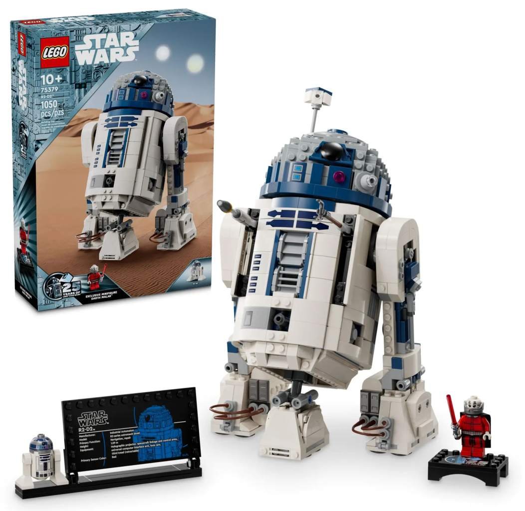 Děti si se stavebnicí R2-D2™ (75379) postaví toho nejmilovanějšího droida v celé galaxii Star Wars™ z kostek LEGO®. Tato hravá stavebnice pro děti od 10 let má spoustu autentických funkcí a malí stavitelé si s ní mohou přehrávat klasické scény i vlastní originální příběhy. Hlavu R2-D2 lze otáčet o 360 stupňů a součástí je také třetí odnímatelná noha pro pohyb, odnímatelný periskop a nástroje. Sestavte si nápaditý výstavní model – součástí stavebnice je také figurka LEGO droida R2-D2, speciální figurka Dartha Malaka se světelným mečem na podstavci na vystavení k 25. výročí LEGO Star Wars a cedulka s informacemi o R2-D2. Stavebnice představuje skvělý tip na dárek pro fanoušky Star Wars a sběratele modelů Star Wars. Součástí je intuitivní návod na stavění. V aplikaci LEGO Builder najdete digitální nástroje pro přibližování a otáčení modelů, s nimiž bude celý zážitek ještě výjimečnější. Sestavitelná figurka LEGO® Star Wars™ R2-D2 – Postavte si z kostek LEGO hravý výstavní model jedné z nejoblíbenějších postav ve světě Star Wars Sestavitelný výstavní model s hravými detaily – Hlavu R2-D2 lze otáčet o 360 stupňů a součástí je také třetí noha pro pohyb, odnímatelný periskop a nástroje Figurka LEGO® R2-D2 a minifigurka LEGO Star Wars™ – Součástí hlavního modelu je figurka LEGO R2-D2 a nechybí minifigurka Dartha Malaka k oslavě 25. výročí LEGO Star Wars Zábavný výstavní kousek – Model doplňuje informační cedulka o R2-D2 a podstavec pro minifigurku Dartha Malaka zdobený logem 25. výročí LEGO® Star Wars™ Tip na dárek pro fanoušky Star Wars™ od 10 let – Tato sběratelská stavebnice LEGO® potěší každého malého fanouška Star Wars a sběratele Star Wars Interaktivní digitální stavění – Aplikace LEGO® Builder s návody na stavění dětem umožňuje přibližovat, otáčet a vizualizovat si digitální verzi modelu, zatímco na něm pracují, ukládat postup stavění a spoustu dalšího Stavebnice LEGO® Star Wars™ pro všechny věkové kategorie – Stavebnice LEGO Star Wars umožňují dětem a dospělým fanouškům přehrávat si slavné scény, vymýšlet vlastní kreativní příběhy a vystavovat si sestavitelné modely Stavějte, hrajte si a vystavujte – Stavebnice droida R2-D2 z kostek LEGO® se skládá z 1 050 dílků a model měří přes 24 cm na výšku, 16 cm na šířku a 11 cm do hloubky