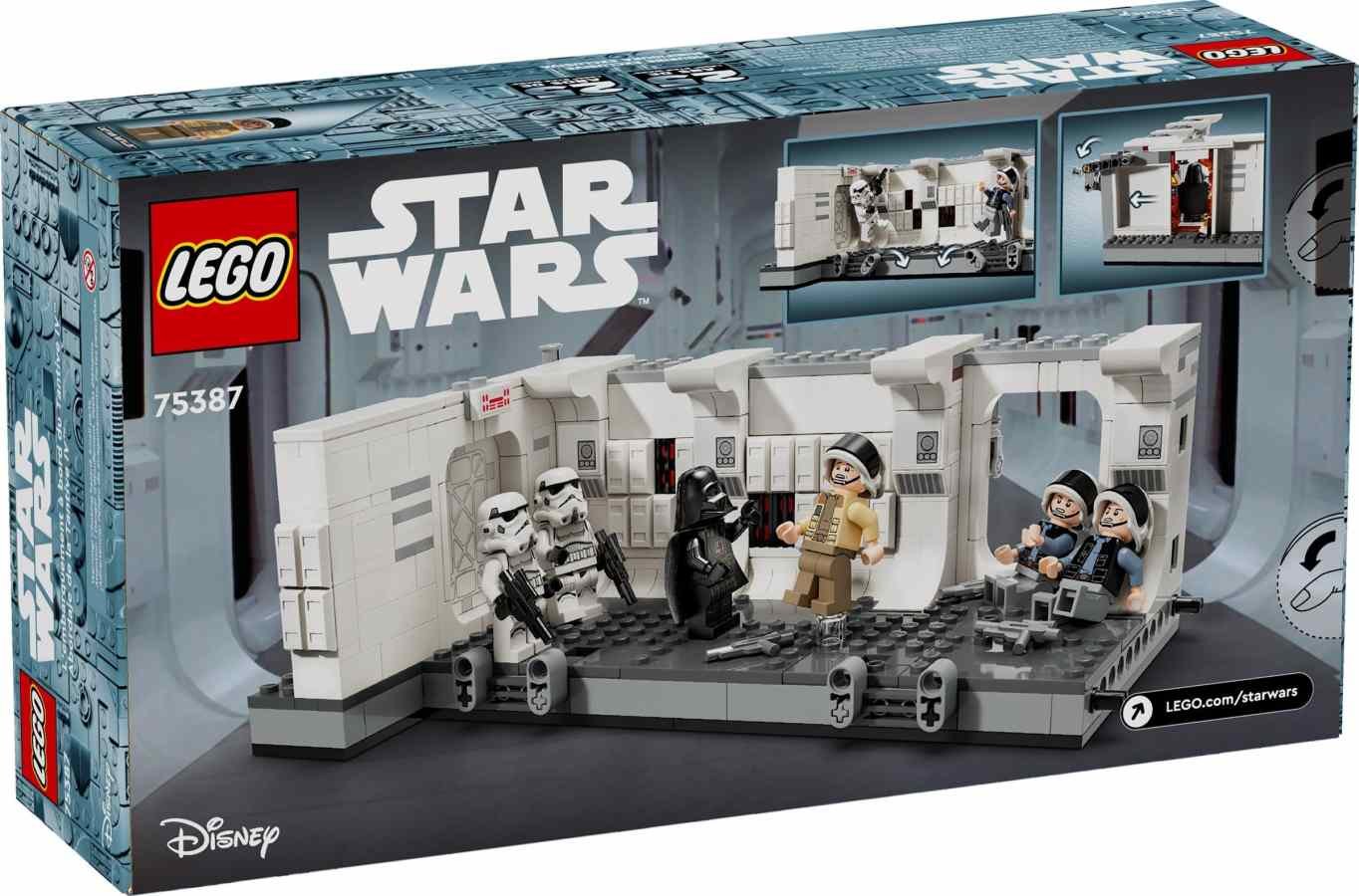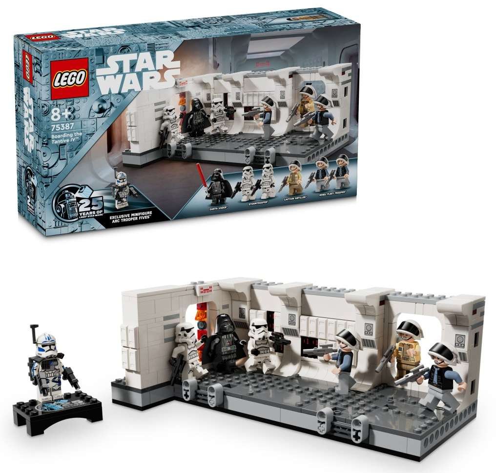 Znovu prožijte scénu, ve které se Darth Vader se Stormtroopery nalodí na vesmírnou loď Tantive IV z filmu Star Wars: Nová naděje, s touto stavebnicí (75387) pro děti od 8 let. Součástí je propracovaná chodba na palubě Tantive IV, kde se Stormtroopeři Dartha Vadera utkají s vojáky flotily povstalců kapitána Antilly. Nechybí páčky, pomocí kterých „rozrazíte“ vstupní dveře a během bitvy porazíte postavy. Spojovače umožní stavitelům připojit další stavebnici 75387 (prodává se samostatně) a rozšířit tak chodbu. Součástí této fantastické sběratelské stavebnice je 7 minifigurek LEGO® Star Wars™, včetně Dartha Vadera, 2 Stormtrooperů, 2 vojáků flotily povstalců a kapitána Antilly a s doplňky pro akční hraní. Stavebnice představuje perfektní dárek pro malé fanoušky a sběratele Star Wars a nechybí speciální minifigurka vojáka ARC Pěťáka s podstavcem na vystavení k 25. výročí LEGO Star Wars. Stavebnice LEGO® Star Wars™ Tantive IV pro děti – Postavte si z kostek slavnou scénu Nástup na palubu Tantive IV z filmu Star Wars: Nová naděje, ve které Darth Vader se svými Stormtroopery bojuje proti vojákům flotily povstalců 7 minifigurek LEGO® Star Wars™ – Darth Vader, 2 Stormtroopeři, 2 vojáci flotily povstalců a kapitán Antilles a minifigurka vojáka ARC Pěťáka s podstavcem na vystavení k 25. výročí LEGO Star Wars Fantasy stavebnice s řadou zábavných funkcí – „Rozrazte“ vstupní dveře na chodbu pomocí páček a shoďte minifigurky LEGO® v bitvě Sběratelská stavebnice LEGO® Star Wars™ pro děti – Spojovače umožní stavitelům připojit další stavebnici 75387 (prodává se samostatně) a rozšířit tak chodbu Zábavný dárek pro fanoušky Star Wars™ od 8 let – Tato sběratelská stavebnice LEGO® představuje skvělý narozeninový dárek pro každého malého fanouška Star Wars a sběratele Star Wars Praktický pomocník – Aplikace LEGO® Builder s návody na stavění dětem umožňuje přibližovat, otáčet a vizualizovat si digitální verzi modelu, zatímco na něm pracují, ukládat postup stavění a spoustu dalšího Stavebnice LEGO® Star Wars™ pro všechny věkové kategorie – Stavebnice LEGO Star Wars se hodí pro děti i dospělé fanoušky, kteří si chtějí přehrávat kultovní scény, vymýšlet nové akční příběhy nebo vystavovat modely z kostek Stavějte, hrajte si a vystavujte – Stavebnice se skládá z 502 dílků a model chodby na lodi Tantive IV měří přes 8 cm na výšku, 22 cm na šířku a 13 cm do hloubky