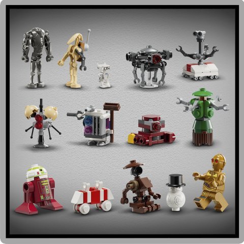 Dopřejte dětem hodiny zábavy při vytváření vlastní droidí dílny a vymýšlení fantasy příběhů s oblíbenými postavami se stavebnicí LEGO® Star Wars™ (75418) Adventní kalendář 2025. Tento adventní kalendář s jedinečnými modely za každým okénkem představuje skvělý vánoční dárek pro kluky, holky a fanoušky od 6 let. Objevte BB-8 v kostýmu sněhuláka, Jawu, Myšího droida a Lékařského droida ve vánočním oblečení a spoustu dalších droidů. Tato sběratelská stavebnice LEGO Star Wars obsahuje také figurku LEGO droida Babu Frika a propojitelné mini modely, se kterými vytvoříte droidí dílnu. Nechybí ani propojitelné vozidlo a jeřáb Jawa, krabice s náhradními droidy navíc... a samozřejmě vánoční stromeček. Tato stavebnice je plná překvapení na každý den, se kterými si během čekání na Vánoc děti i celá rodina užijí hodiny kreativního hraní a zábavy. Dárková stavebnice LEGO® Star Wars™ Adventní kalendář 2025 – Děti se stanou droidími techniky, jako je Babu Frik, a každý den před Vánoci objeví jedinečnou hračku, se kterými si pak postaví vlastní droidí dílnu Postavy LEGO® Star Wars™ – Minifigurky LEGO C-3PO a Jawa (vánoční), figurka LEGO Babu Frika a 5 figurek droidů LEGO: R7-A7, BD-72, bitevní droid ze šrotu, BB-8 (sněhulák) a super bitevní droid 8 sestavitelných droidů LEGO® – Pit droid, Dobíjecí droid, Buzz droid, Lékařský droid (vánoční), B2EMO, droid Treadwell, Myší droid (vánoční) a Průzkumný droid 9 miniaturních stavebnic – Pracovní stůl, židle, stojan na nářadí, police, krabice s náhradními díly droidů, jeřáb a kbelík na vytvoření droidí dílny a sestavitelné vozidlo Jawů a vánoční stromek Dárek LEGO® Star Wars™ pro děti od 6 let – Tento nostalgický dárkový Adventní kalendář se skládá z 368 dílků a představuje zábavný vánoční dárek pro kluky, holky a fanoušky Star Wars Stavějte a hrajte si – Zkombinujte minimodely a postavičky z této stavebnice s dalšími sadami LEGO® Star Wars™ (prodávají se samostatně) a vymyslete nekonečné příběhy Sběratelské stavebnice LEGO® Star Wars™ – Stavebnice LEGO Star Wars umožňují dětem i dospělým přehrávání klasických scén, vymýšlení vlastních fantastických dobrodružství nebo prostě vystavit modely z kostek Vánoční aktivity pro děti, přátele a rodinu – Tento adventní kalendář se skládá z 263 dílků a potěší děti, které si s ním můžou hrát sólo nebo s kamarády nebo jako vánoční aktivita pro celou rodinu
