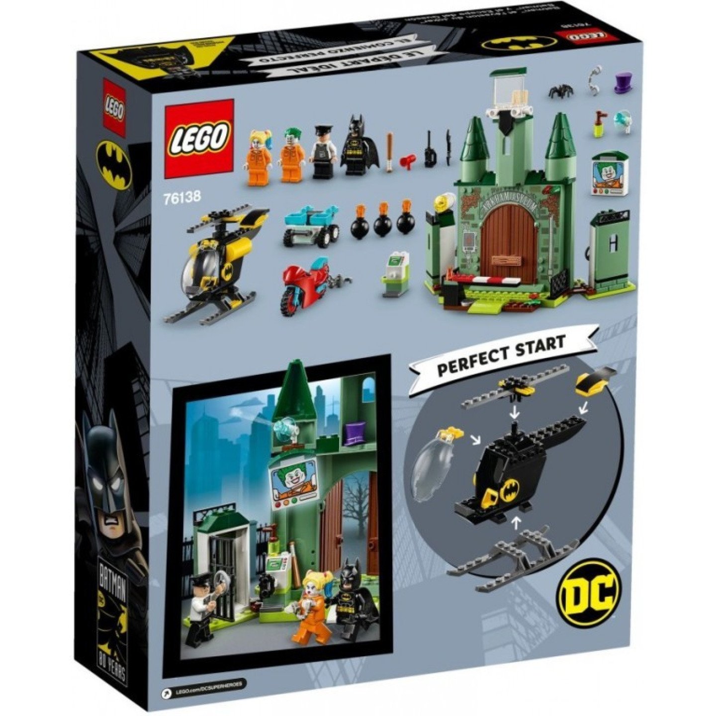 Malé děti si zamilují hraní na Batmana, který se pokouší překazit útěk padouchů z vězení v sadě LEGO® DC Batman 76138 Batman™ a útěk Jokera. Tato LEGO sada 4+ obsahuje snadno sestavitelný Batmanův vrtulník se speciální kostkou pro začátek stavění, která umožní i začínajícím stavitelům zažít radost ze skládání budov, vozidel a dalších modelů. Stavebnice obsahuje model ústavu Arkham Asylum se spoustou detailů, včetně 2 vězeňských cel se zdmi, které lze strhnout pomocí háku na řetězu připojeného k motorce Harley Quinn. Ideální narozeninový dárek pro všechny děti. Součástí sady jsou 4 LEGO minifigurky se zbraněmi a jednoduchý návod na stavění a hraní. V aplikaci LEGO Life pro smartphony a tablety je pro tuto superhrdinskou sadu k dispozici návod na stavění PLUS. Snadno použitelný, intuitivní návod na stavění umožní dětem za pochodu přibližovat, otáčet a vizualizovat jejich výtvory pomocí speciálního režimu. Nákup na legenio.cz, to je rychlé odeslání za skvělé ceny! LEGO® sady 4+ jsou speciálně navrženy tak, aby byly pro malé stavitele zábavné a snadné a pomohly jim rozvíjet důvěru ve vlastní schopnosti skrze jednoduché stavební kroky. Ideální pro seznámení s LEGO stavebnicemi. Tato superhrdinská stavebnice obsahuje 4 minifigurky: Batmana, Harley Quinn™, Jokera a vězeňského dozorce. Arkham Asylum má otevírací vchodové dveře s odnímatelným zámkem, strážní věž se sedadlem pro minifigurku, 2 křídla vězení s otevíracími celami pro minifigurky, rotující sestavitelný reflektor, TV, ve které je Joker, sestavitelný ovládací panel s odnímatelnými pouty, a navíc 3 Batmanovy padoušské trofeje – sestavitelnou nádobu s plynem vyvolávajícím strach od Scarecrowa, paprskovou zbraň Mr. Freeze™ a klobouk Tučňáka. Vrtulník Batmana je vybaven začátečnickou kostkou, otevíracím kokpitem pro minifigurku a otočnými rotory. Motorka Harley Quinn nabízí prostor pro minifigurku, a navíc řetěz a hák pro tažení pojízdného katapultu nebo stržení zdí vězení. Pojízdný katapult je vybaven 2 vystřelovači a 3 sestavitelnými bombami. V této parádní batmanovské sadě najdeš také batarang Batmana a baseballovou pálku Harley Quinn. Minifigurky Harley Quinn™ a Jokera mají vězeňské oblečení a jsou novinkou pro červen 2019.¨ LEGO® sady 4+ představují dětem svět filmových hrdinů, známých televizních postav a hrdinů všedního dne. Ideální dárek pro předškoláky. LEGO® sady 4+ bývaly dříve označovány jako LEGO Juniors a lze je kombinovat se všemi ostatními originálními LEGO sadami a kostkami. Aplikace LEGO® Life ti poskytne přístup k intuitivnímu návodu na stavění PLUS. Pomůže se stavěním i menším stavitelům, jelikož nabízí přehledné funkce přibližování, otáčení a speciálního režimu, které jim umožní vizualizovat si jejich výtvory za pochodu. Model ústavu Arkham Asylum měří více než 21 cm na výšku, 23 cm na šířku a 10 cm do hloubky. Batmanův vrtulník měří přes 9 cm na výšku, 14 cm na délku a 4 cm na šířku.