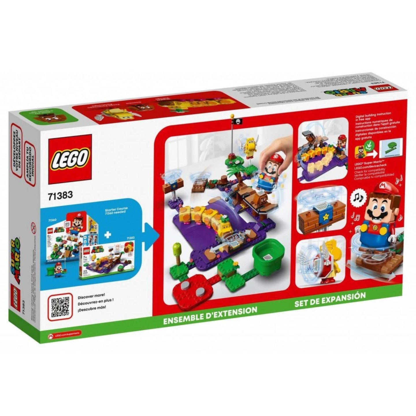 Pořádně s ním zatřeste, aby se před vámi rozvinul tajný most. Dejte si pozor na Goombu, který se právě pod mostem skrývá. Vyhněte se jedovaté bažině pomocí otočné plošiny a voru. Získejte úžasné schopnosti díky akční kostce Super Star a završte epickou cestu tím, že porazíte Koopu Paratroopu! Mladí stavitelé mohou nyní rozšířit svou startovací sadu LEGO® Super Mario™ o rozšiřující set Wiggler a jedovatá bažina (71383) a vytvářet a stavět z kostek nejrůznější nové výzvy v džungli. Obsahuje LEGO® figurky kultovních protivníků, kterými jsou Wiggler, Goomba a Koopa Paratroopa. Těm se musí LEGO® Mario™ (figurka není součástí balení) postavit a přemoci je. Obsahuje posuvnou plošinu, most a plavidlo. Navíc nechybí speciální kostka Super Star, díky které můžete získat jedinečné schopnosti a ještě více odměn. Tento LEGO® set s 374 dílky představuje jedinečný dárek k narozeninám, Vánocům či jakékoliv jiné příležitosti pro děti ve věku od 7 let, které vlastní startovací set Dobrodružství s Mariem (71360), který je vyžadován pro kompletní herní zážitek. Tento modul v základním rozestavení měří přes 6 cm na výšku, 31 cm na šířku a 26 cm do hloubky. Lze jej však různě přestavovat a kombinovat s dalšími sety z řady LEGO® Super Mario™. Bezplatná aplikace LEGO® Super Mario™ nabízí návody na stavění a bezpečnou platformu pro sdílení herních nápadů. Seznam kompatibilních zařízení s operačním systémem Android a iOS najdete na stránkách LEGO.com/devicecheck. Sběratelské sety LEGO® Super Mario™ přenášejí do reálného světa kultovní postavičku, za kterou stojí společnost Nintendo®, a nabízí neomezenou škálu možností, jak rozšiřovat, přestavovat, přizpůsobovat a vytvářet vlastní herní úrovně. Kvalitní LEGO® dílky splňují přísné oborové standardy, díky čemuž jsou kompatibilní a umožňují snadné a bezpečné spojování. LEGO® kostky a dílky pouštíme na zem, drtíme, kroutíme, zahříváme a analyzujeme, abychom zajistili, že splňují přísné normy vztahující se k bezpečnosti dětí.
