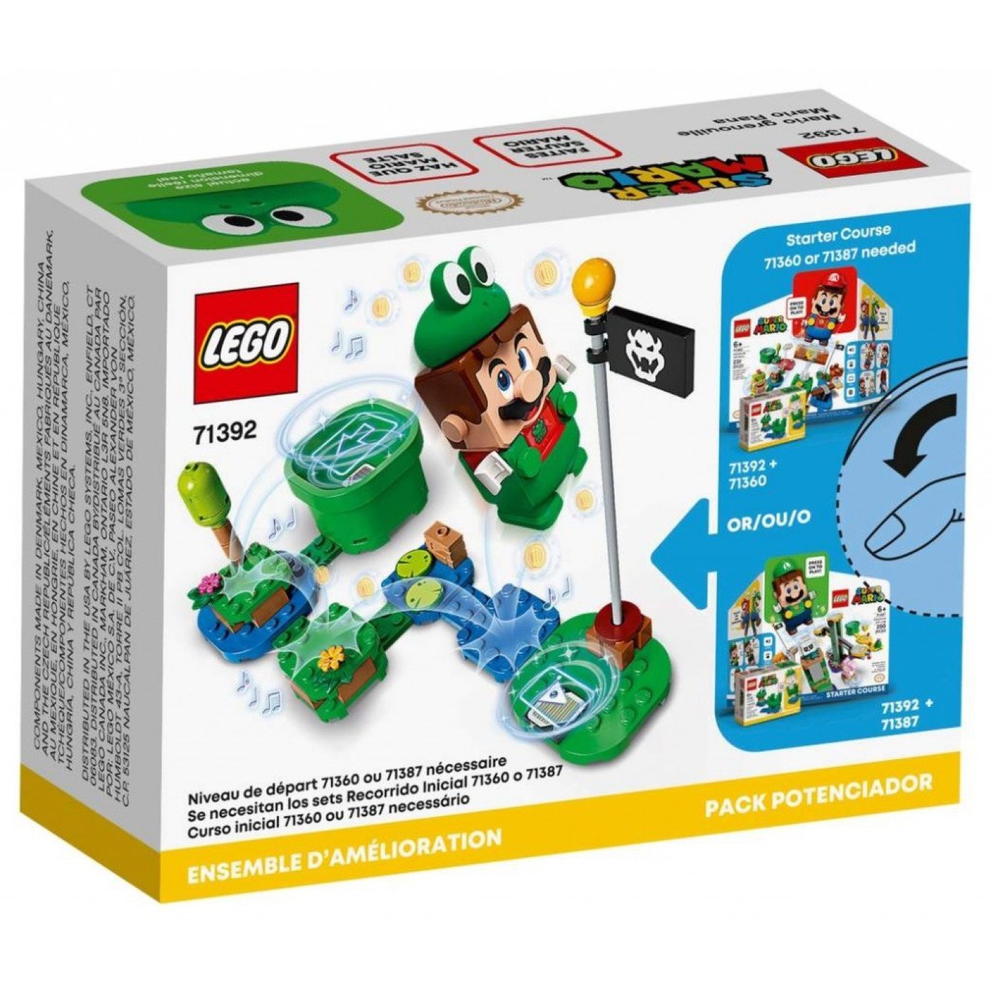 Sada přináší interaktivní obleček žáby pro LEGO® Maria (figurka není součástí balení), který hráčům umožňuje získávat digitální mince navíc za skákání jako žába. S dokončením každého skoku figurka vydává originální zvuky. Jedná se o ideální dárek pro děti, které mají startovací set 71360 s LEGO figurkou Maria nebo sadu 71387, která obsahuje LEGO® figurku Luigiho. Stavějte a hrajte si Návod k sestavení této LEGO sady najdete v krabici nebo v bezplatné aplikaci LEGO Super Mario. Ta navíc nabízí bezpečnou platformu pro děti, kde mohou sdílet kreativní stavitelské nápady a herní tipy. Skutečná dobrodružství se Super Mariem Sběratelské sety LEGO® Super Mario přivádí legendární postavičku z videoher do reálného světa. Startovací sada, rozšiřující sety a doplňkové balíčky poskytují fanouškům neomezené kreativní možnosti při vytváření vlastních úrovní pro jednoho i více hráčů. Dopřejte fanouškům LEGO® Super Maria možnost vnést do svých herních úrovní pořádnou dávku skákání a cákání prostřednictvím interaktivního žabího oblečku (71392) pro LEGO® Maria (figurka není součástí balení). Tento sestavitelný doplněk z kostek je určen pro LEGO® figurku Maria ze startovacího setu Dobrodružství s Mariem (71360) nebo LEGO® figurku Luigiho ze startovacího setu Dobrodružství s Luigim (71387). Jakmile má LEGO® Mario™ obleček na sobě, získávají hráči digitální mince navíc za skákání připomínající žábu. Figurka s dokončením každého skoku vydává originální zvuky. Sada obsahuje také leknín a modré vodní LEGO® dílky, pomocí kterých mohou děti rozšířit své stávající úrovně. Díky ilustrovanému návodu bude stavění hračka. Bezplatná aplikace LEGO® Super Mario™ obsahuje návody na stavění, inspirativní tipy pro kreativní hraní i spoustu dalšího. Seznam kompatibilních zařízení s operačním systémem Android a iOS najdete na stránce LEGO.com/devicecheck. Tato sběratelská hračka představuje perfektní narozeninový nebo vánoční dárek pro kreativní děti ve věku od 6 let, který poslouží jako zábavný doplněk ke startovacím či rozšiřujícím setům LEGO® Super Mario™. K dispozici jsou také další oblečky, které lze použít se startovacími či rozšiřujícími sety LEGO® Super Mario™ – například obleček Včela Mario (71393). Úžasné sety LEGO® Super Mario™ přenášejí oblíbené postavičky z videoher Super Mario do reálného světa a dávají fanouškům nekonečnou škálu možností, jak rozšiřovat, přestavovat, přizpůsobovat a vytvářet herní úrovně pro jednoho i více hráčů. Od roku 1958 splňují LEGO® kostky přísné oborové normy, což znamená, že je lze vždy jednoduše a snadno spojovat a rozpojovat. LEGO® dílky testujeme téměř všemi představitelnými způsoby, abychom zajistili, že vyhovují přísným celosvětově uznávaným bezpečnostním standardům.