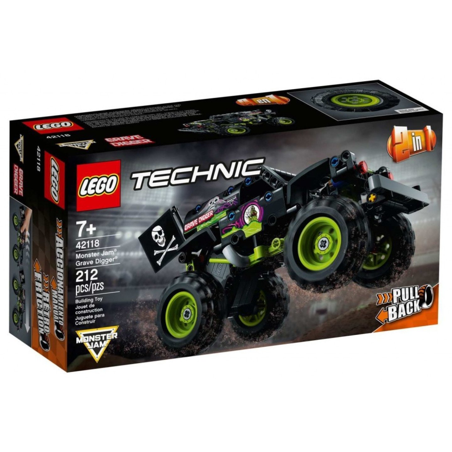 Autentické prvky zahrnují potisk vozu Grave Digger s duchem a plameny, obrovské pneumatiky, pohyblivou vlajku a červené světlomety. Sledujte, jak dětem pod rukama ožívá vzrušující svět show Monster Jam, zatímco předvádí epické kousky jednoho z nejslavnějších a nejkultovnějších monster trucků všech dob. Úžasná stavebnice 2 v 1 Jste připraveni na novou výzvu? To je skvělá zpráva! Model Grave Digger můžete přestavět na terénní buginu pro ještě větší porci tvůrčí zábavy. V bezplatné aplikaci s LEGO návody ke stavění navíc najdete návod Instructions PLUS. Tento interaktivní návod přináší nástroje přiblížení a otáčení, které dětem pomohou se stavěním. Inspirace pro novou generaci inženýrů Modely vozidel z řady LEGO Technic vypadají a fungují stejně jako jejich skutečné protějšky, proto představují skvělý úvod do světa techniky a mechaniky pro všechny mladé LEGO fanoušky.   Dejte svým malým milovníkům monster trucků možnost přehrávat si oblíbené kaskadérské kousky s LEGO® Technic modelem vozu Grave Digger® (42118) ze slavné show Monster Jam®. Autentické prvky zahrnují obrovské pneumatiky, samolepky a spoustu dalšího. Dvakrát víc legrace! Model monster trucku lze přestavět na terénní buginu, takže se děti mohou těšit rovnou na 2 stavitelské výzvy a dvakrát tolik akce. Díky natahovacímu motoru si s monster truckem a terénní buginou užijete hodiny vzrušující zábavy. Hledáte tip na skvělý dárek pro děti, které milují monster trucky? Tato sada je ideální pro stavitele ve věku od 7 let, kteří milují show Monster Jam® a modely aut. Skvělé funkce zahrnují ohebnou vlajku, která se pohybuje nahoru a dolů, a červené světlomety – úplně jako na skutečném voze Grave Digger®. Model stroje ze show Monster Jam® měří přes 11 cm na výšku, 24 cm na délku (s vlajkou) a 11 cm na šířku. Nechybí návod, který vám pomůže se sestavením modelu vozu Grave Digger®. V bezplatné aplikaci s LEGO® návody na stavění navíc najdete digitálního pomocníka Instructions PLUS. Návod na sestavení terénní buginy je k dispozici na internetu. Řada LEGO Technic nabízí pokročilé stavebnice pro mladé LEGO fanoušky připravené na další stavitelskou výzvu. Již od roku 1958 splňují kostky LEGO® Technic ty nejpřísnější standardy, díky čemuž jsou dílky konzistentní, kompatibilní a vždy dobře drží. Dílky LEGO® Technic pouštíme na zem, zahříváme, drtíme, kroutíme a analyzujeme, abychom zajistili, že vyhovují přísným globálním bezpečnostním normám.