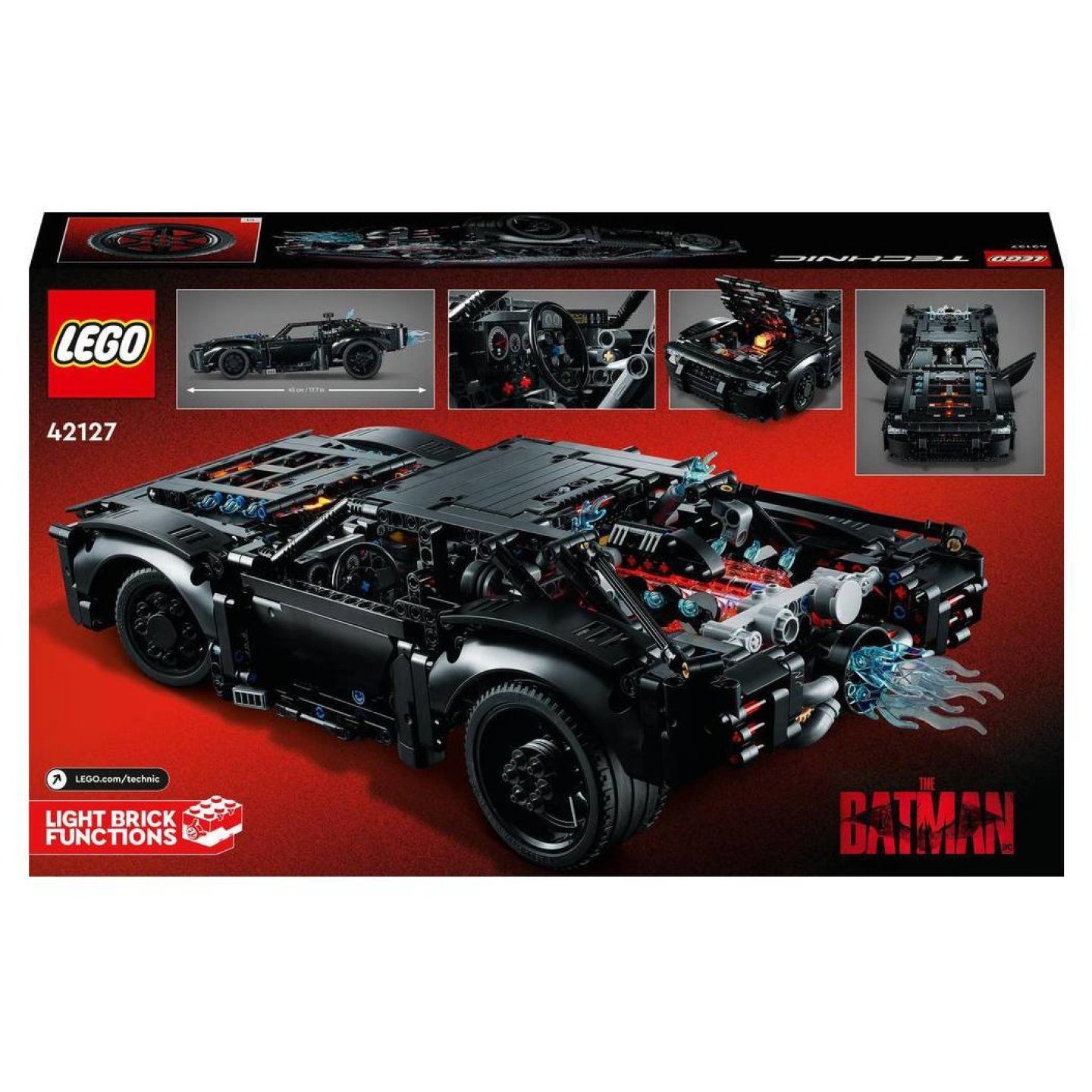 Fanoušci superhrdinů si nepochybně užijí strhující výzvu v podobě repliky kultovního BATMOBILU od LEGO® Technic. Vysoce propracovaný model inspirovaný nejnovější verzí BATMOBILU z filmu THE BATMAN, který bude do kin uveden v roce 2022, potěší realistickým designem a spoustou nadupaných funkcí.  Rozjasněte noc Model je vybaven 2 světelnými kostkami – jednou červenou a jednou žlutou. Červené světlo dodává průhlednému motoru v zadní části úžasnou záři, zatímco žlutá kostka osvětluje přední mřížku chladiče. Mezi ostatní cool funkce patří řízení předních kol, diferenciál na zadních kolech, otáčející se plamen a otevírací dveře a kapota. Děti mohou model nejprve pořádně prozkoumat a poté jej umístit na čestné místo na výstavce, aby vzdaly hold oblíbenému superhrdinovi. Skvělý úvod do světa techniky Sady od LEGO Technic přinášejí realistické mechanismy a pohybové funkce, které umožní stavitelům všech věkových kategorií prozkoumat svět skutečného inženýrství. Postavte si BATMOBIL – Připomeňte si všechny detaily kultovního superhrdinského vozu s úžasným modelem 42127 BATMAN – BATMOBIL od LEGO® Technic pro děti i pro dospělé Stejně jako ve filmu THE BATMAN – Tento autentický model představuje věrnou repliku LEGO® Technic BATMOBILU z filmu, který vstoupí do kin v roce 2022. Sledujte, jak se auto rozsvítí – Součástí jsou 2 světelné kostky, které vdechnou BATMOBILU život. Červené světlo ozařuje průsvitný motor, zatímco žlutá kostka mřížku chladiče v přední části Plno zajímavých prvků – Mezi cool funkce patří přední řízení, diferenciál na zadních kolech, pohyblivé písty, otáčející se plamen, a k tomu navíc otevírací dveře a kapota Ideální pro děti od 10 let – Děti a dospělí se zálibou v autech superhrdinů jistě rádi vzdají hold svému oblíbenému vozu. Ta pravá volba, pokud hledáte báječné dárky pro fanoušky Batmana Jako stvořený na výstavku – Prozkoumejte všechny funkce, jimiž se tento nadupaný model jen hemží, a pak jej umístěte na výstavku, aby každý mohl obdivovat jeho autentický vzhled Dokonalé rozměry – Model měří přes 11 cm na výšku (včetně volantu a plamenu v horní části), 45 cm na délku (včetně plamenu v zadní části) a 17 cm na šířku Zážitek, který stojí za to – Řada LEGO® Technic přináší pokročilé modely pro fanoušky, kteří se cítí na náročnější stavitelskou výzvu Kvalita na prvním místě – Kostky LEGO® Technic splňují ty nejpřísnější standardy, díky čemuž jsou konzistentní, kompatibilní a vždy dobře drží Garance bezpečnosti – Dílky LEGO® Technic pouštíme na zem, zahříváme, drtíme, kroutíme a analyzujeme, abychom zajistili, že vyhovují přísným globálním bezpečnostním standardům