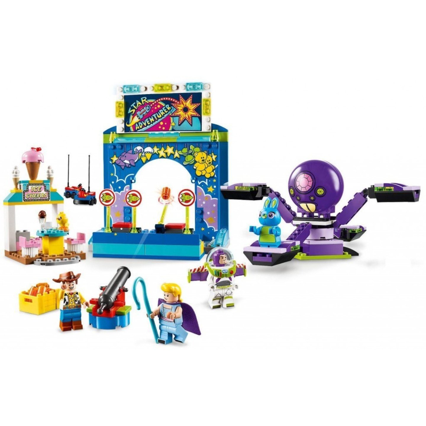 Tato akční sada je speciálně navržena tak, aby byla zábavná a snadná pro předškoláky a menší děti. Obsahuje barevnou karnevalovou střelnici s velkou cedulí a laserovým dělem, a k tomu navíc začátečnickou podložku, která umožní i těm, kteří stavějí poprvé, vychutnat si radost ze stavění budov, vozidel a dalších modelů na vlastní pěst. Tato zábavná předškolní stavebnice také obsahuje rotující atrakci Terrorantulus s nastavitelnými rameny, 2 bourací autíčka s podvozkem pro začátečníky a obchod se zmrzlinou s pokladnou, stolem, lavičkami a cedulí. Součástí je jednoduchý průvodce na stavění a hraní, který pomůže vašemu malému návštěvníkovi karnevalu porozumět účelu jednotlivých stavebních kroků a rozvíjet představivost a důvěru ve vlastní stavitelské schopnosti ve známém prostředí Příběhu hraček. Obsahuje minifigurky Woodyho, Buzz Rakeťáka a Pastýřky, a k tomu navíc LEGO® figurky Duckyho a Bunnyho. Nákup na legenio.cz, to je rychlé odeslání za skvělé ceny! Sady LEGO® 4+ jsou speciálně navrženy tak, aby byly pro malé stavitele zábavné a snadné a pomohly jim rozvíjet důvěru ve vlastní schopnosti skrze jednoduché stavební kroky. Ideální pro seznámení s LEGO stavebnicemi. Obsahuje 3 minifigurky z Příběhu hraček: Woodyho, Buzz Rakeťáka a Pastýřku, a k tomu navíc LEGO® postavy Duckyho a Bunnyho. Obsahuje karnevalovou střelnici, zdobené rakety, které lze sestřelit a oddělit, funkční dělo, a k tomu navíc začátečnickou podložku a zdobenou desku na zeď, která umožní vašemu dítěti rychle začít stavět a hrát si s LEGO® kostkami v zábavném světě Příběhu hraček od Disney Pixar. Obsahuje také obchod se zmrzlinou včetně pokladny, stolu a laviček. Tato roztomilá sada také obsahuje atrakci Terrorantulus, která se otáčí a má nastavitelná ramena, a k tomu navíc 2 bourací autíčka s podvozkem pro začátečníky. Mezi doplňky najdeš 6 výstupků, bednu, 3 zdobené rakety, velkou zmrzlinu, 2 malé zmrzliny, zmrzlinový pohár, lžíci na zmrzlinu, kbelík a pastýřskou hůl Pastýřky. Pomozte vašemu dítěti přehrávat si vzrušující scény z Příběhu hraček nebo si vymýšlet vlastní příběhy. LEGO® sady 4+ představují dětem svět filmových hrdinů, známých televizních postav a hrdinů všedního dne. LEGO® sady 4+ bývaly dříve označovány jako LEGO Juniors a lze je kombinovat se všemi ostatními LEGO stavebnicemi. Tato kreativní sada z filmu Toy Story 4 představujte ideální dárek pro předškoláky a menší děti. Karnevalová střelnice měří přes 10 cm na výšku, 12 cm na šířku a 3 cm do hloubky. Bourací autíčka měří přes 9 cm na výšku, 3 cm na délku a 3 cm na šířku. Stánek se zmrzlinou měří přes 11 cm na výšku, 6 cm na šířku a 8 cm do hloubky. Atrakce Terrorantulus měří přes 8 cm na výšku, 19 cm na šířku a 19 cm do hloubky.