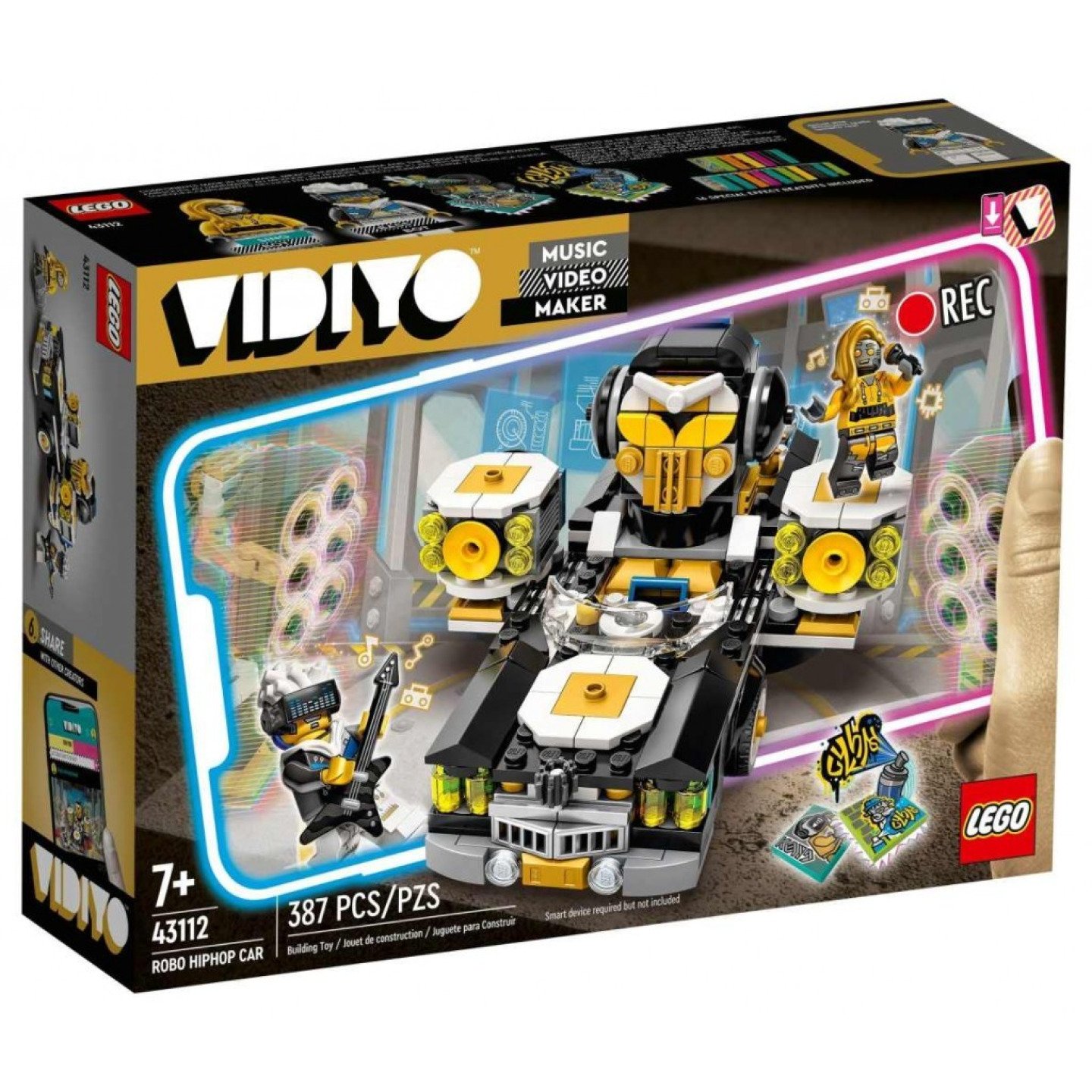 Stáhněte si bezplatnou aplikaci a naskenujte minifigurky. Pak pomocí aplikace naskenujte hotový model a sledujte, jak se ve videích vašeho potomka auto promění v digitální pódium! Děti si zamilují výzvy, které na ně čekají při vytváření vlastních hudebních videí. Poté se o svá díla podělí s ostatními autory na bezpečné sociální platformě. Vystoupení začíná! Model Robo HipHop Car je nabitý funkcemi a přináší dětem hodiny zábavy jak v offline světě, tak v aplikaci. Děti si zamilují možnost otáčet hlavami, reproduktory a světly na fyzickém modelu a měnit tak robotické prostředí a osvětlení v hudebních videích. Dopřejte si nejrůznější hudební zážitky Stavebnice LEGO VIDIYO dětem umožní stát se režiséry a hvězdami vlastních hudebních videí a sdílet je s ostatními v bezpečném prostředí. Sledujte, jak budou rozvíjet svou kreativitu při vytváření videí nabitých různými žánry, zábavnými postavami, tanečními pohyby a úžasnými efekty. Inspirujte děti k tomu, aby se staly režiséry a hvězdami vlastních hudebních videí s pomocí stavebnice Robo HipHop Car (43112) od LEGO® VIDIYO™. Součástí jsou 2 minifigurky s hudebními doplňky, 14 náhodných BeatBitů a 2 unikátní BeatBity. Stáhněte si bezplatnou aplikaci LEGO® VIDIYO™, která umožňuje skenování minifigurek, BeatBitů se speciálními efekty a samotného modelu. Podívejte se, jak se váš výtvor promění v pódium, na němž to postavy ve vašem videu pořádně rozjedou! Skenujte BeatBity prostřednictvím aplikace a odemkněte speciální efekty – například ten, který přidá do písní parádní robotické zvuky nebo ten, který každé video zkrášlí pomocí graffiti. Děti si zamilují možnost ovlivňovat prostřednictvím změn fyzického LEGO® modelu prostředí ve videu – jako když třeba vymění hlavy, čímž vykouzlí moderně vybavenou garáž nebo parkoviště vyhrazené pro graffiti. Zábavný hudební zážitek pro kluky a holky od 7 let, kterým chcete udělat radost. Tato sada se zároveň hodí jakodárek pro všechny děti, které mají rády hudbu, tanec a vystupování. Auto měří přes 8 cm na výšku, 18 cm na délku a 12 cm na šířku. Aplikace LEGO® VIDIYO™ je kompatibilní s vybranými zařízeními iOS a Android. Zkontroluj kompatibilitu na www.LEGO.com/devicecheck. Než se na webové stránky podíváš, zeptej se rodičů nebo zákonných zástupců. Stavebnice LEGO® VIDIYO™ umožňují dětem stát se režiséry, producenty a hudebními hvězdami a režírovat a sdílet vlastní hudební videa – a to vše v rámci nové sociální platformy. Již od roku 1958 splňují kostky LEGO® Technic ty nejpřísnější standardy, díky čemuž jsou dílky konzistentní, kompatibilní a vždy dobře drží. LEGO® dílky pouštíme na zem, zahříváme, drtíme, kroutíme a analyzujeme, abychom zajistili, že splňují vysoké globální bezpečnostní standardy.